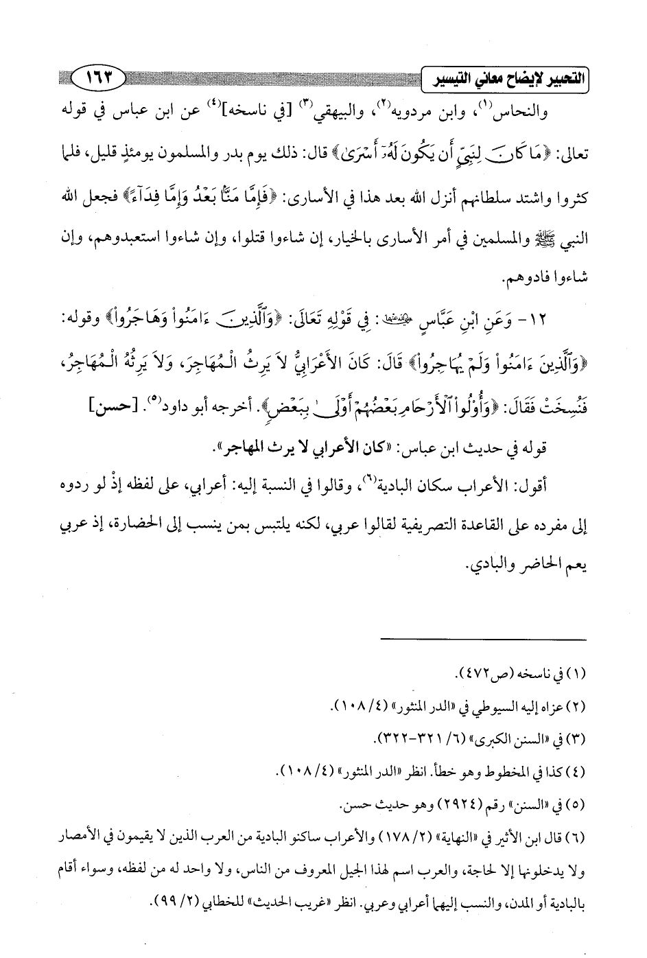12 - وَعَنِ ابْنِ عَبَّاسٍ - رضي الله عنهما -: فِي قَوْلِهِ تَعَالَى: {وَالَّذِينَ آمَنُوا وَهَاجَرُوا} وقوله: {وَالَّذِينَ آمَنُوا وَلَمْ يُهَاجِرُوا} قَالَ: كَانَ الأَعْرَابِيُّ لاَ يَرِثُ الْمُهَاجِرَ، وَلاَ يَرِثُهُ الْمُهَاجِرُ، فَنُسِخَتْ فَقَالَ: {وَأُولُو الْأَرْحَامِ بَعْضُهُمْ أَوْلَى بِبَعْضٍ}. أخرجه أبو داود (¬5). [حسن]