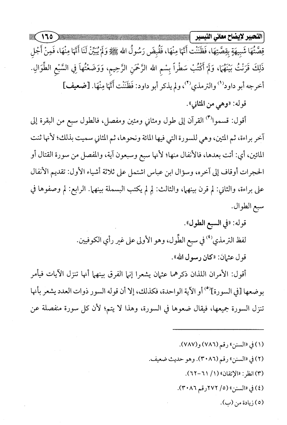 قِصَّتُهَا شَبِيهَةٍ بِقِصَّتِهَا، فَظَنَنْت أَنَّهَا مِنْهَا، فَقُبِضَ رَسُولُ الله - صلى الله عليه وسلم - وَلَمْ يُبَيِّنْ لَنَا أَنَّهَا مِنْهَا، فَمِنْ أَجْلِ ذَلِكَ قَرَنْتُ بَيْنَهُمَا، وَلَمْ أَكْتُبْ سَطْراً بِسْمِ الله الرَّحْمَنِ الرَّحِيمِ، وَوَضَعْتُهاَ فِي السَّبْعِ الطِّوَالِ. أخرجه أبو داود (¬1) والترمذي (¬2)، ولم يذكر أبو داود: فَظَنَنْت أَنَّهَا مِنْهَا. [ضعيف]