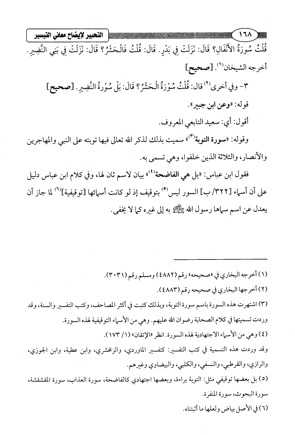 (¬5) بل بعضها توقيفي مثل: التوبة براءة، وبعضها اجتهادي كالفاضحة، سورة العذاب، سورة المقشقشة، سورة البحوث، سورة المنفرة.
