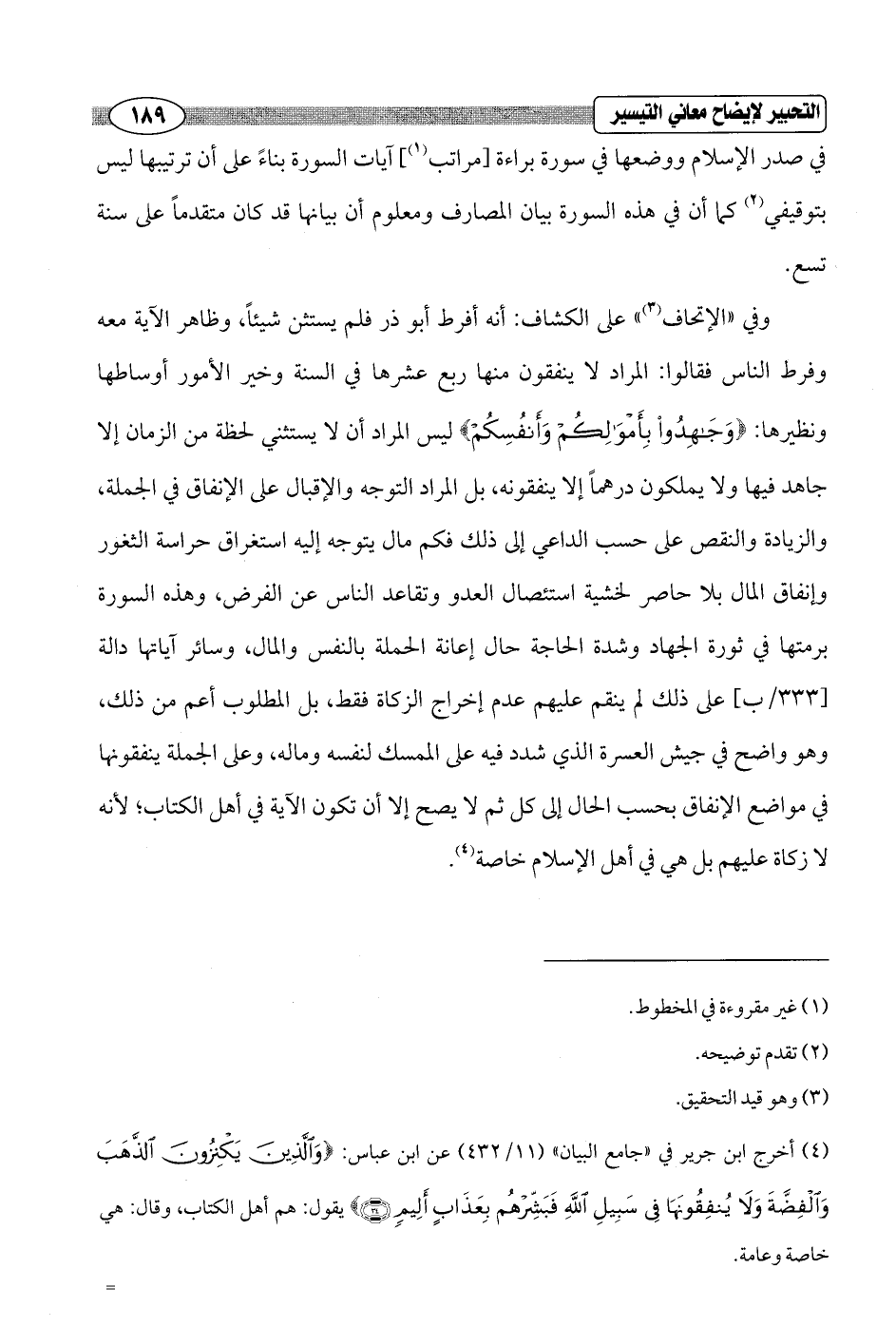 في صدر الإسلام ووضعها في سورة براءة [مراتب (¬1)] آيات السورة بناءً على أن ترتيبها ليس بتوقيفي (¬2) كما أن في هذه السورة بيان المصارف ومعلوم أن بيانها قد كان متقدماً على سنة تسع.