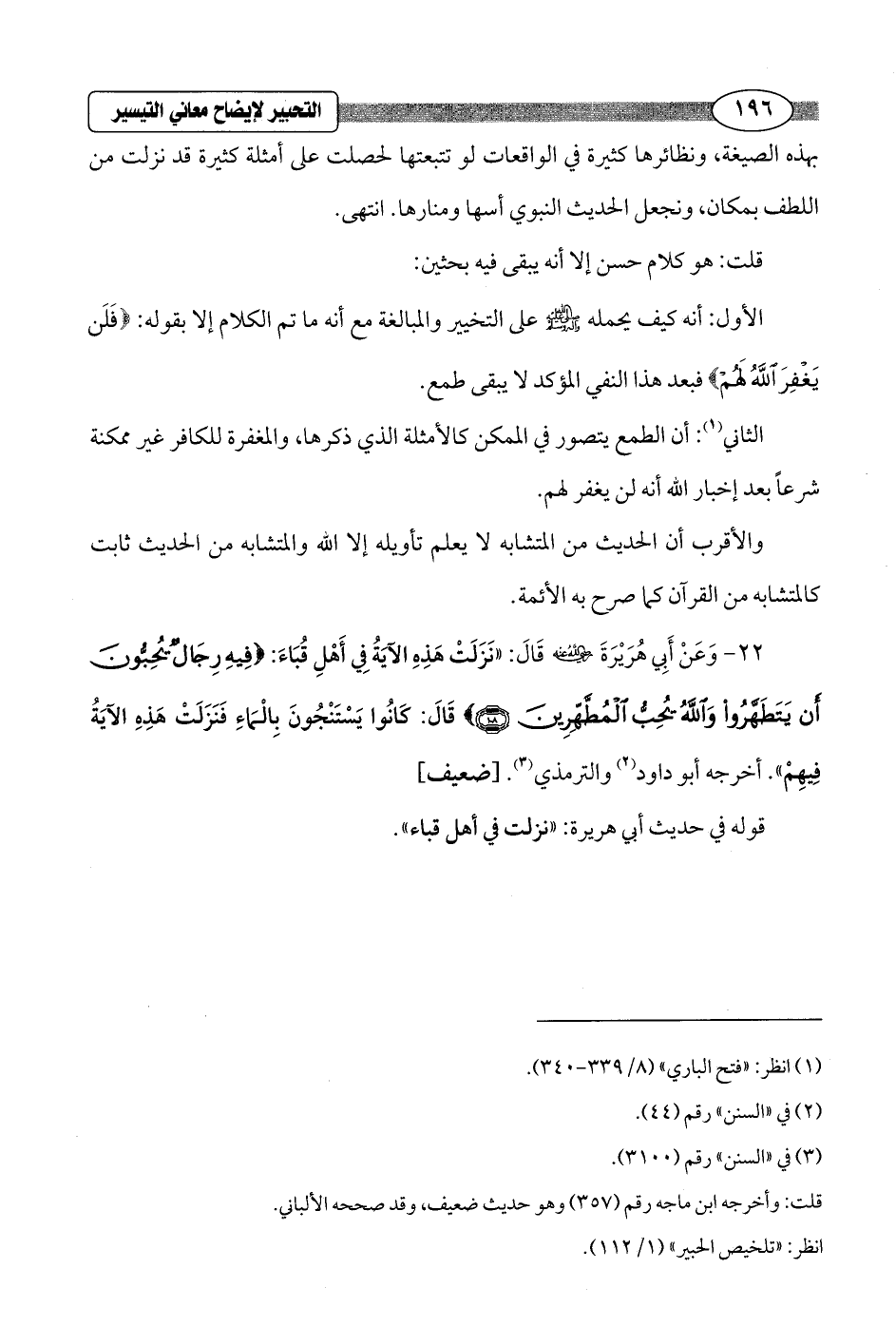22 - وَعَنْ أَبِي هُرَيْرَةَ - رضي الله عنه - قَالَ: "نَزَلَتْ هَذِهِ الآيَةُ فِي أَهْلِ قُبَاءَ: {فِيهِ رِجَالٌ يُحِبُّونَ أَنْ يَتَطَهَّرُوا وَاللَّهُ يُحِبُّ الْمُطَّهِّرِينَ (108)} قَالَ: كَانُوا يَسْتَنْجُونَ بِالْمَاءِ فَنَزَلَتْ هَذ الآيَةُ فِيهِمْ". أخرجه أبو داود (¬2) والترمذي (¬3). [ضعيف]