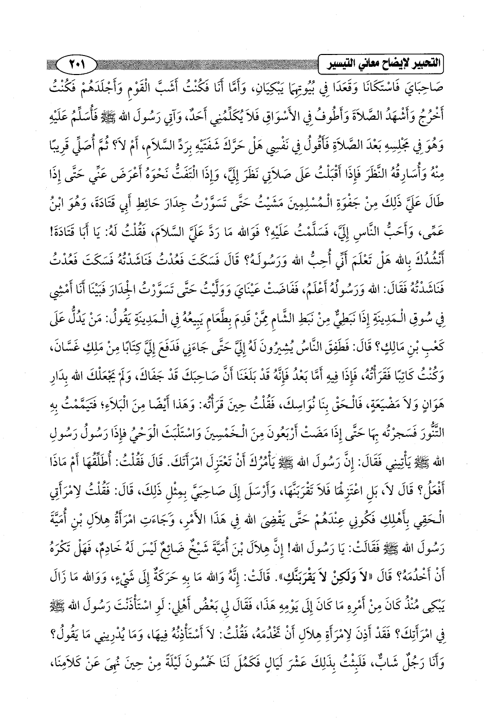 صَاحِبَايَ فَاسْتكَانَا وَقَعَدَا فِي بُيُوتهِمَا يَبْكِيَانِ، وَأَمَّا أَنَا فَكُنْتُ أَشَبَّ الْقَوْمِ وَأَجْلَدَهُمْ فَكُنْتُ أَخْرُجُ وَأَشْهَدُ الصَّلاَةَ وَأَطُوفُ فِي الأَسْوَاقِ فَلاَ يُكَلِّمُنِي أَحَدٌ، وَآتِي رَسُولَ الله - صلى الله عليه وسلم - فَأُسَلِّمُ عَلَيْهِ وَهُوَ فِي مَجْلِسِهِ بَعْدَ الصَّلاَةِ فَأَقُولُ فِي نَفْسِي هَلْ حَرَّكَ شَفَتَيْهِ بِرَدِّ السَّلاَمِ، أَمْ لاَ؟ ثُمَّ أُصَلِّي قَرِيبًا مِنْهُ وَأُسَارِقُهُ النَّظَرَ فَإِذَا أَقْبَلْتُ عَلَى صَلاَتِي نَظَرَ إِلَيَّ، وَإِذَا الْتَفَتُّ نَحْوَهُ أَعْرَضَ عَنِّي حَتَّى إِذَا طَالَ عَلَيَّ ذَلِكَ مِنْ جَفْوَةِ الْمُسْلِمِينَ مَشَيْتُ حَتَّى تَسَوَّرْتُ جِدَارَ حَائِطِ أَبِي قَتَادَةَ، وَهُوَ ابْنُ عَمِّى، وَأَحَبُّ النَّاسِ إِلَيَّ، فَسَلَّمْتُ عَلَيْهِ؟ فَوَالله مَا رَدَّ عَلَيَّ السَّلاَمَ، فَقُلْتُ لَهُ: يَا أَبَا قَتَادَةَ! أَنْشُدُكَ بِالله هَلْ تَعْلَمَ أَنِّي أُحِبُّ الله وَرسُولَهُ؟ قَالَ فَسَكَتَ فَعُدْتُ فَنَاشَدْتُهُ فَسَكَتَ فَعُدْتُ فَنَاشَدْتُهُ فَقَالَ: الله وَرَسُولُهُ أَعْلَمُ، فَفَاضَتْ عَيْنَايَ وَوَلَّيْتُ حَتَّى تَسَوَّرْتُ الجدَارَ فَبَيْنَا أنَّا أَمْشِي فِي سُوقِ الْمَدِينَةِ إِذَا نَبَطِيٌّ مِنْ نَبَطِ الشَّامِ مِمَّنْ قَدِمَ بِطَّعَامِ يَبِيعُهُ فِي الْمَدِينَةِ يَقُولُ: مَنْ يَدُلُّ عَلَى كَعْبِ بْنِ مَالِكٍ؟ قَالَ: فَطَفِقَ النَّاسُ يُشِيرُونَ لَهُ إِلَيَّ حَتَّى جَاءَنِي فَدَفَعَ إِلَيَّ كِتَابًا مِنْ مَلِكِ غَسَّانَ، وَكُنْتُ كَاتِبًا فَقَرَأْتُهُ، فَإِذَا فِيهِ أَمَّا بَعْدُ فَإِنَّهُ قَدْ بَلَغَنَا أَنَّ صَاحِبَكَ قَدْ جَفَاكَ، وَلَمْ يَجْعَلْكَ الله بِدَارِ هَوَانٍ وَلاَ مَضيَعَةٍ، فَالْحَقْ بِنَا نُوَاسِكَ، فَقُلْتُ حِينَ قَرَأْتُه: وَهَذا أَيْضًا مِنَ الْبَلاَءِ؛ فتيمَّمْتُ بِهِ التَّنُّورَ فَسَجرْتُه بِهَا حَتَّى إِذَا مَضتْ أَرْبَعُونَ مِنَ الْخَمْسِينَ وَاسْتَلْبَثَ الْوَحْيُ فإِذَا رَسُولُ رَسُولِ الله - صلى الله عليه وسلم - يَأْتِينِي فَقَالَ: إِنَّ رسُولَ الله - صلى الله عليه وسلم - يَأْمُرُكَ أَنْ تَعْتَزِلَ امْرَأتكَ. قَالَ فَقُلْتُ: أُطَلِّقُهَا أَمْ مَاذَا أَفْعَلُ؟ قَالَ لاَ، بَلِ اعْتَزِلْهَا فَلاَ تَقْرَبَنَّهَا، وَأَرْسَلَ إِلَى صَاحِبَيَّ بِمِثْلِ ذَلِكَ، قَالَ: فَقُلْتُ لِامْرَأَتِي الْحَقِي بِأَهْلِكِ فَكُونِي عِنْدَهُمْ حَتَّى يَقْضِىَ الله فِي هَذَا الأَمْرِ، وَجَاءَتِ امْرَأَةُ هِلاَلِ بْنِ أُمَيَّةَ رَسُولَ الله - صلى الله عليه وسلم - فَقَالَتْ: يَا رَسُولَ الله! إِنَّ هِلاَلَ بْنَ أُمَيَّةَ شَيْخٌ ضَائِعٌ لَيْسَ لَهُ خَادِمٌ، فَهَلْ تَكْرَهُ أَنْ أَخْدُمَهُ؟ قَالَ "لاَ وَلكِنْ لاَ يَقْرَبَنَّكِ". قَالَتْ: إِنَّهُ وَالله مَا بِهِ حَرَكَةٌ إِلَى شَيْءٍ، وَوَالله مَا زَالَ يَبْكِى مُنْذُ كَانَ مِنْ أَمْرِهِ مَا كَانَ إِلَى يَوْمِهِ هَذَا، فَقَالَ لِي بَعْضُ أَهلي: لَوِ اسْتَأْذَنْتَ رَسُولَ الله - صلى الله عليه وسلم - فِي امْرَأَتِكَ؟ فَقَدْ أَذِنَ لِامْرَأَةِ هِلاَلِ أَنْ تَخْدُمَهُ فَقُلْتُ: لاَ أَسْتَأْذِنُهُ فِيهَا، وَمَا يُدْرِينِي مَا يَقُولُ؟ وَأَنَا رَجُلٌ شَابٌّ، فَلَبِثْتُ بِذَلِكَ عَشْرَ لَيَالٍ فَكَمُلَ لَنَا خَمْسُونَ لَيْلَةً مِنْ حِينَ نُهِىَ عَنْ كَلاَمِنَا،