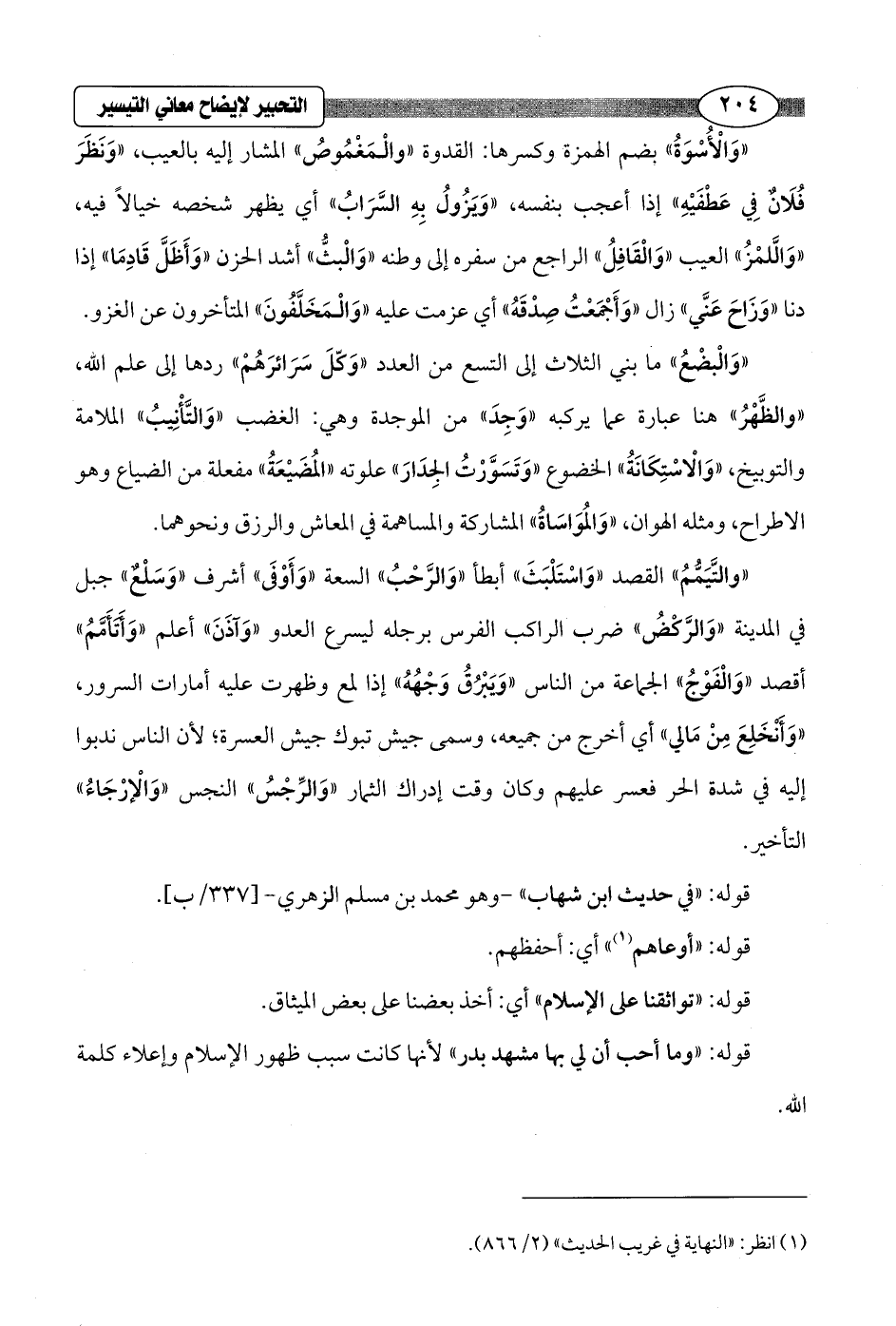 "وَالْبضْعُ" ما بني الثلاث إلى التسع من العدد "وَكّلَ سَرَائرَهُمْ" ردها إلى علم الله، "والظَّهْرُ" هنا عبارة عما يركبه "وَجِدَ" من الموجدة وهي: الغضب "وَالتَّأْنِيبُ" الملامة والتوبيخ، "وَالْاسْتِكَانَةُ" الخضوع "وَتَسَوَّرْتُ الجِدَارَ" علوته "المُضيْعَةُ" مفعلة من الضياع وهو الاطراح، ومثله الهوان، "وَالمُوَاسَاةُ" المشاركة والمساهمة في المعاش والرزق ونحوهما.