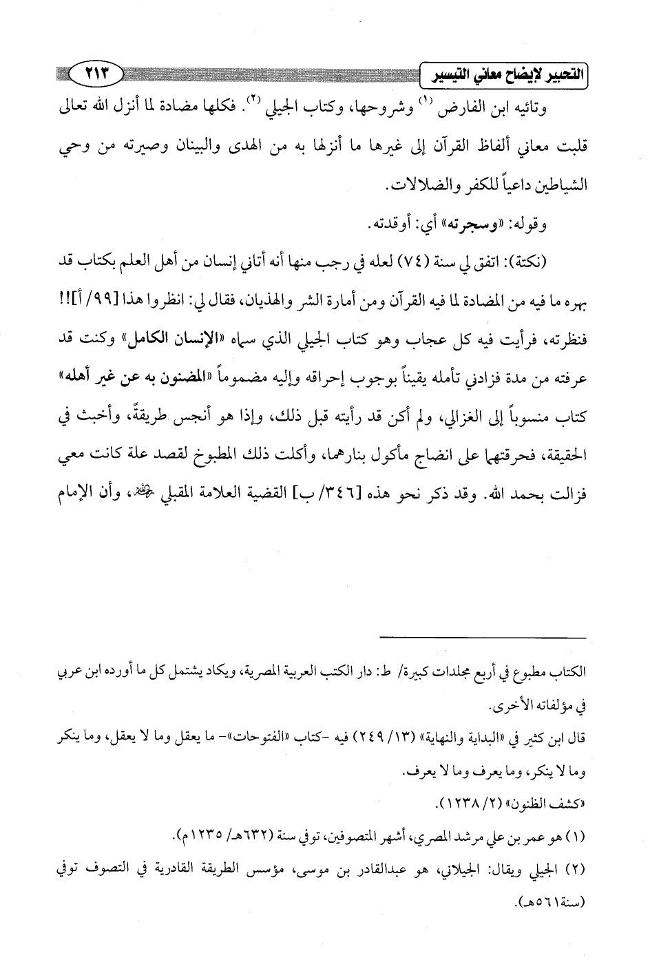 وتائيه ابن الفارض (¬1) وشروحها، وكتاب الجيلي (¬2). فكلها مضادة لما أنزل الله تعالى قلبت معاني ألفاظ القرآن إلى غيرها ما أنزلها به من الهدى والبينان وصيرته من وحي الشياطين داعياً للكفر والضلالات.
