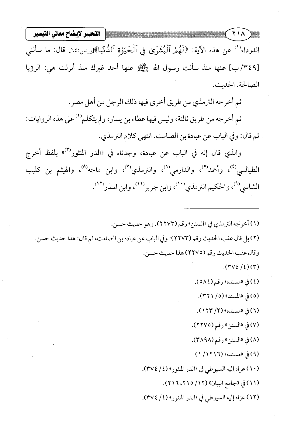الدرداء (¬1) عن هذه الآية: {لَهُمُ الْبُشْرَى فِي الْحَيَاةِ الدُّنْيَا} [يونس: 64] قال: ما سألني [349/ ب] عنها منذ سألت رسول الله - صلى الله عليه وسلم - عنها أحد غيرك منذ أنزلت هي: الرؤيا الصالحة. الحديث.