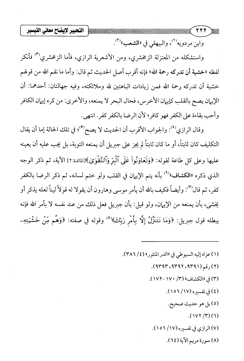 وقال الرازي (¬4): والجواب الأقرب أن الحديث لا يصح (¬5)؛ في تلك الحالة إما أن يقال التكليف كان ثابتاً، أو ما كان ثابتاً لم يجز على جبريل أن يمنعه التوبة، بل يجب عليه أن يعينه عليها وعلى كل طاعة لقوله: {وَتَعَاوَنُوا عَلَى الْبِرِّ وَالتَّقْوَى} [المائدة: 2] الآية، ثم ذكر الوجه الذي ذكره "الكشاف" (¬6) بأنه يتم الإيمان في القلب ولو ختم لسانه، ثم ذكر الرضا بالكفر كفر، ثم قال (¬7): وأيضاً فكيف بالله أن يأمر موسى وهارون أن يقولا له قولاً ليناً لعله يذكر أو يخشى، بأن يمنعه من الإيمان، ولو قيل: بأن جبريل فعل ذلك من عند نفسه لا بأمر الله فإنه يبطله قول جبريل: {وَمَا نَتَنَزَّلُ إِلَّا بِأَمْرِ رَبِّكَ} (¬8) وقوله في صفته: {وَهُمْ مِنْ خَشْيَتِهِ ¬__________