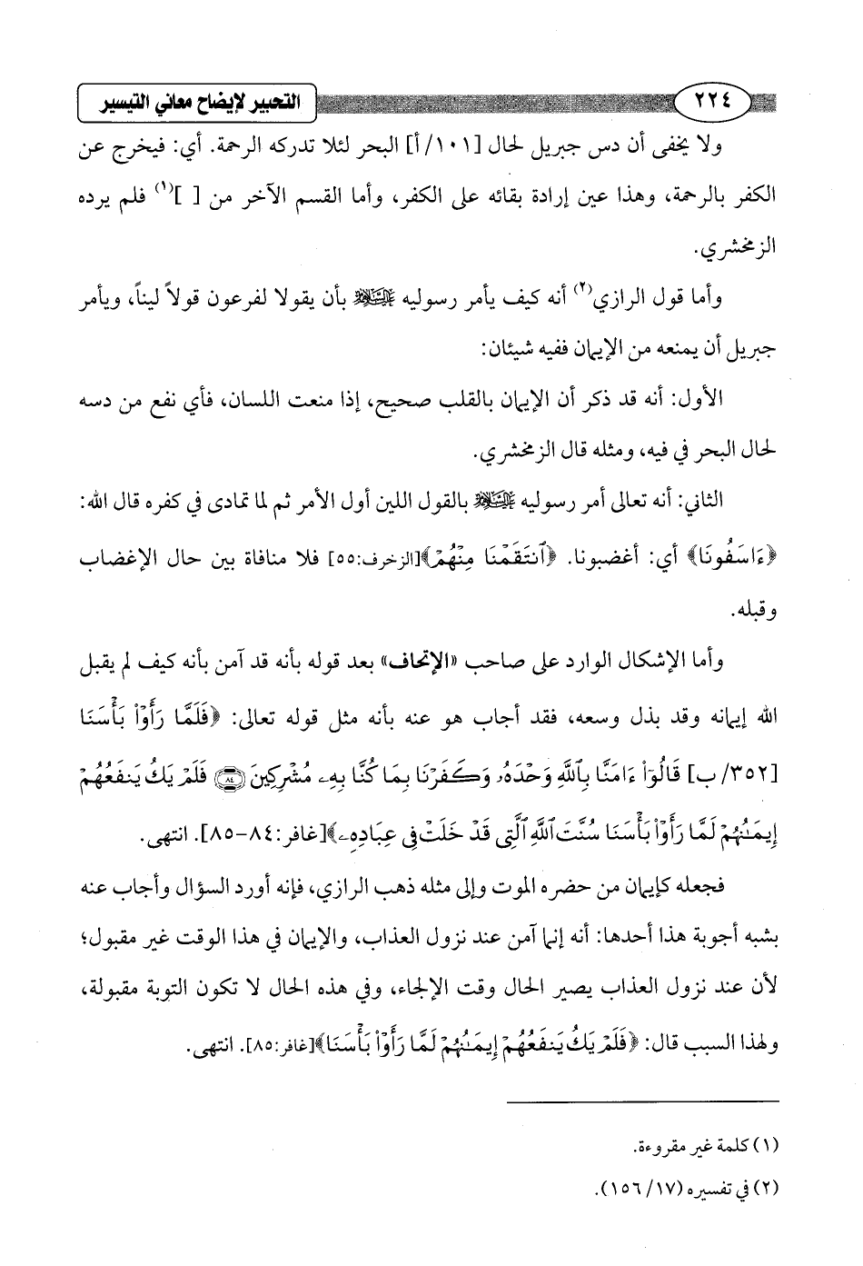 وأما الإشكال الوارد على صاحب "الإتحاف" بعد قوله بأنه قد آمن بأنه كيف لم يقبل الله إيمانه وقد بذل وسعه، فقد أجاب هو عنه بأنه مثل قوله تعالى: {فَلَمَّا رَأَوْا بَأْسَنَا [352/ ب] قَالُوا آمَنَّا بِاللَّهِ وَحْدَهُ وَكَفَرْنَا بِمَا كُنَّا بِهِ مُشْرِكِينَ (84) فَلَمْ يَكُ يَنْفَعُهُمْ إِيمَانُهُمْ لَمَّا رَأَوْا بَأْسَنَا سُنَّتَ اللَّهِ الَّتِي قَدْ خَلَتْ فِي عِبَادِهِ} [غافر: 84، 85]. انتهى.