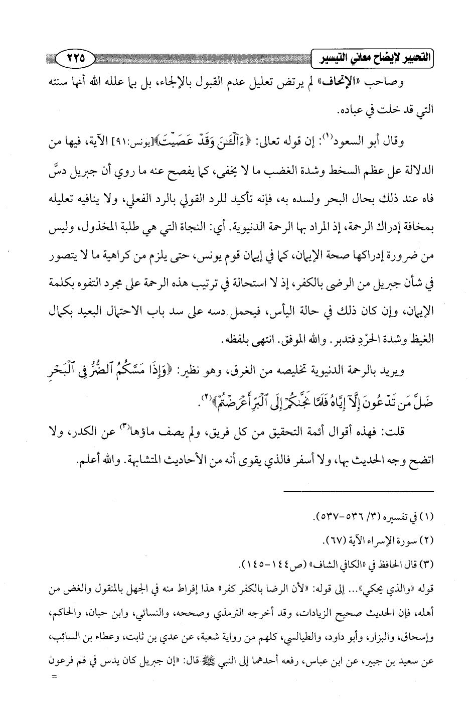 وقال أبو السعود (¬1): إن قوله تعالى: {آلْآنَ وَقَدْ عَصَيْتَ} [يونس: 91] الآية، فيها من الدلالة على عظم السخط وشدة الغضب ما لا يخفى، كما يفصح عنه ما روي أن جبريل دسَّ فاه عند ذلك بحال البحر ولسده به، فإنه تأكيد للرد القولي بالرد الفعلي، ولا ينافيه تعليله بمخافة إدراك الرحمة، إذ المراد بها الرحمة الدنيوية. أي: النجاة التي هي طلبة المخذول، وليس من ضرورة إدراكها صحة الإيمان، كما في إيمان قوم يونس، حتى يلزم من كراهية ما لا يتصور في شأن جبريل من الرضى بالكفر، إذ لا استحالة في ترتيب هذه الرحمة على مجرد التفوه بكلمة الإيمان، وإن كان ذلك في حالة اليأس، فيحمل. دسه على سد باب الاحتمال البعيد بكمال الغيظ وشدة الحرْدِ فتدبر. والله الموفق. انتهى بلفظه.
