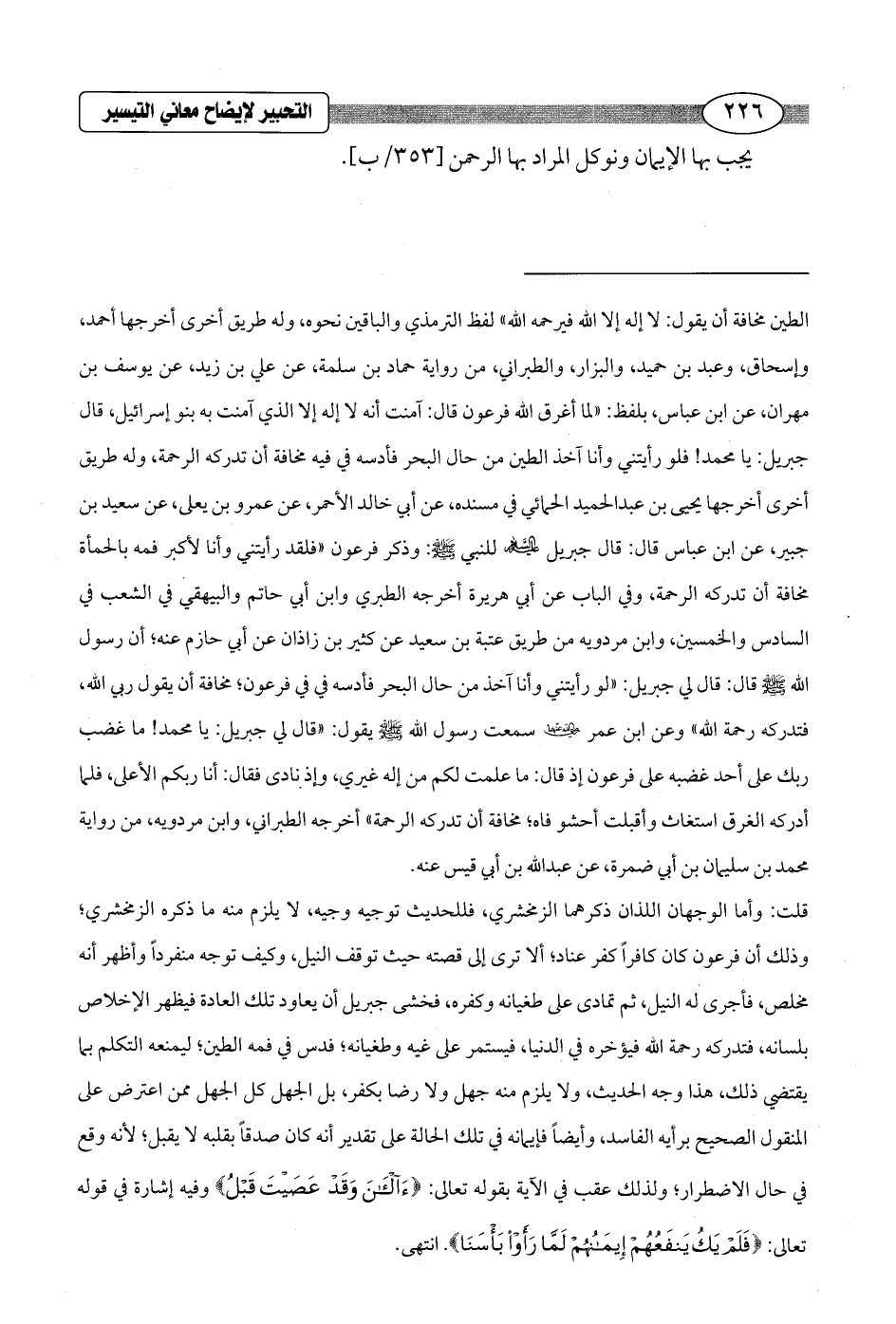 قلت: وأما الوجهان اللذان ذكرهما الزمخشري، فللحديث توجيه وجيه, لا يلزم منه ما ذكره الزمخشري؛ وذلك أن فرعون كان كافراً كفر عناد؛ ألا ترى إلى قصته حيث توقف النيل، وكيف توجه منفرداً وأظهر أنه مخلص، فأجرى له النيل، ثم تمادى على طغيانه وكفره، فخشى جبريل أن يعاود تلك العادة فيظهر الإخلاص بلسانه، فتدركه رحمة الله فيؤخره في الدنيا، فيستمر على غيه وطغيانه؛ فدس في فيه الطين؛ ليمنعه التكلم بما يقتضي ذلك، هذا وجه الحديث، ولا يلزم منه جهل ولا رضا بكفر، بل الجهل كل الجهل ممن اعترض على المنقول الصحيح برأيه الفاسد، وأيضاً فإيمانه في تلك الحالة على تقدير أنه كان صدقاً بقلبه لا يقبل؛ لأنه وقع في حال الاضطرار؛ ولذلك عقب في الآية بقوله تعالى: {آلْآنَ وَقَدْ عَصَيْتَ قَبْلُ} وفيه إشارة في قوله تعالى: {فَلَمْ يَكُ يَنْفَعُهُمْ إِيمَانُهُمْ لَمَّا رَأَوْا بَأْسَنَا}. انتهى.