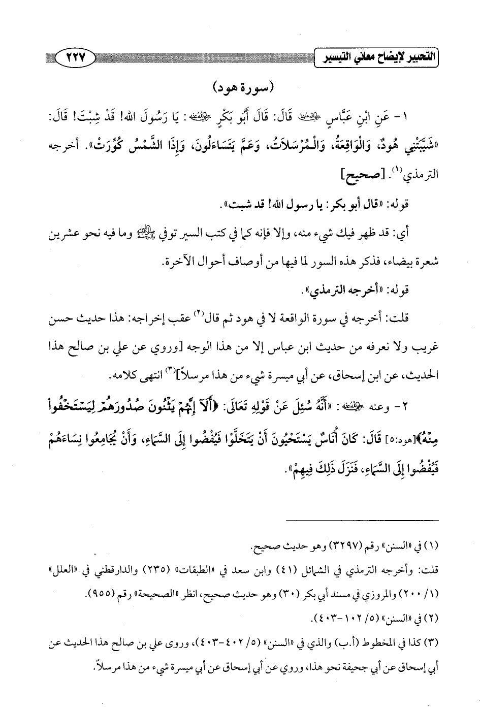 1 - عَنِ ابْنِ عَبَّاسٍ - رضي الله عنهما - قَالَ: قَالَ أَبُو بَكْرٍ - رضي الله عنه -: يَا رَسُولَ الله! قَدْ شِبْتَ! قَالَ: "شَيَّبَتْنِي هُودٌ, وَالْوَاقِعَةُ، وَالْمُرْسَلاَتُ، وَعَمَّ يَتَسَاءَلُونَ، وَإِذَا الشَّمْسُ كوِّرَتْ". أخرجه الترمذي (¬1). [صحيح]