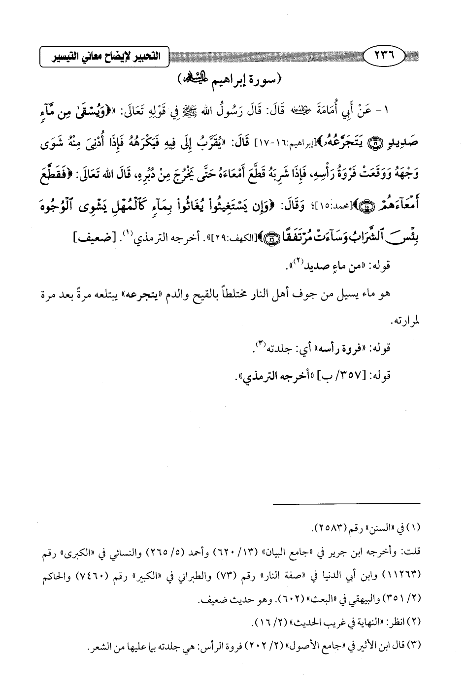 1 - عَنْ أَبِي أُمَامَةَ - رضي الله عنه - قَالَ: قَالَ رَسُولُ الله - صلى الله عليه وسلم - فِي قَوْلِهِ تَعَالَى: " {وَيُسْقَى مِنْ مَاءٍ صَدِيدٍ (16) يَتَجَرَّعُهُ} [إبراهيم: 16، 17] قَالَ: "يُقَرَّبُ إِلَى فِيهِ فَيَكْرَهُهُ فَإِذَا أُدْنِىَ مِنْهُ شَوَى وَجْهَهُ وَوَقَعَتْ فَرْوَةُ رَأْسِهِ، فَإِذَا شَرِبَهُ قَطَّعَ أَمْعَاءَهُ حَتَّى يَخْرُجَ مِنْ دُبُرِهِ، قَالَ الله تَعَالَى: {فَقَطَّعَ أَمْعَاءَهُمْ (15)} [محمد: 15]؛ وَقَالَ: {وَإِنْ يَسْتَغِيثُوا يُغَاثُوا بِمَاءٍ كَالْمُهْلِ يَشْوِي الْوُجُوهَ بِئْسَ الشَّرَابُ وَسَاءَتْ مُرْتَفَقًا (29)} [الكهف: 29] ". أخرجه الترمذي (¬1). [ضعيف]