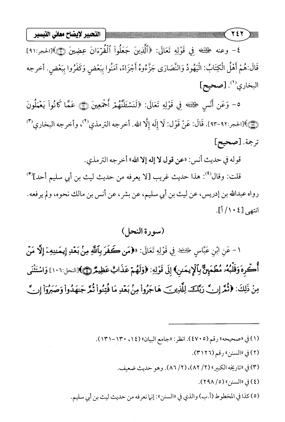 5 - وَعَن أَنَسٍ - رضي الله عنه - فِي قَوْلِهِ تَعَالَى: {لَنَسْأَلَنَّهُمْ أَجْمَعِينَ (92) عَمَّا كَانُوا يَعْمَلُونَ (93)} [الحجر: 92، 93]. قَالَ: عَنْ قَوْل: لَا إِلَه إِلَّا الله. أخرجه الترمذي (¬2)، وأخرجه البخاري (¬3) ترجمة. [صحيح]
