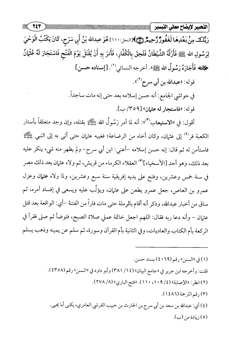 رَبَّكَ مِنْ بَعْدِهَا لَغَفُورٌ رَحِيمٌ (110)} [النحل: 110] هُوَ عبد الله بْنُ أَبِي سَرْحٍ، كانَ يَكْتُبُ الْوَحْيَ لِرَسُولِ الله - صلى الله عليه وسلم - فَأَزَلَّهُ الشَّيْطَانُ فَلَحِقَ بِالْكُفَّارِ، فَأَمَرَ بِهِ أَنْ يُقْتَلَ يَوْمَ الْفَتْحِ فَاسْتَجَارَ لَهُ عُثْمَانُ - رضي الله عنه - فَأَجَارَهُ رَسُولُ الله - صلى الله عليه وسلم -". أخرجه النسائي (¬1). [إسناده حسن]
