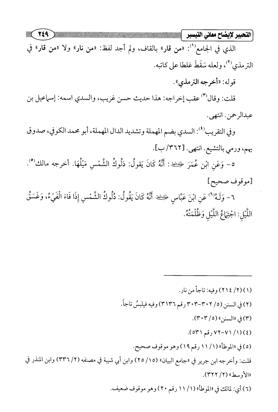 5 - وَعَنِ ابْن عُمَرَ - رضي الله عنهما -: أَنَّهُ كَانَ يَقولُ: دَلُوكُ الشَّمْسِ مَيْلُهَا. أخرجه مالك (¬5). [موقوف صحيح]
