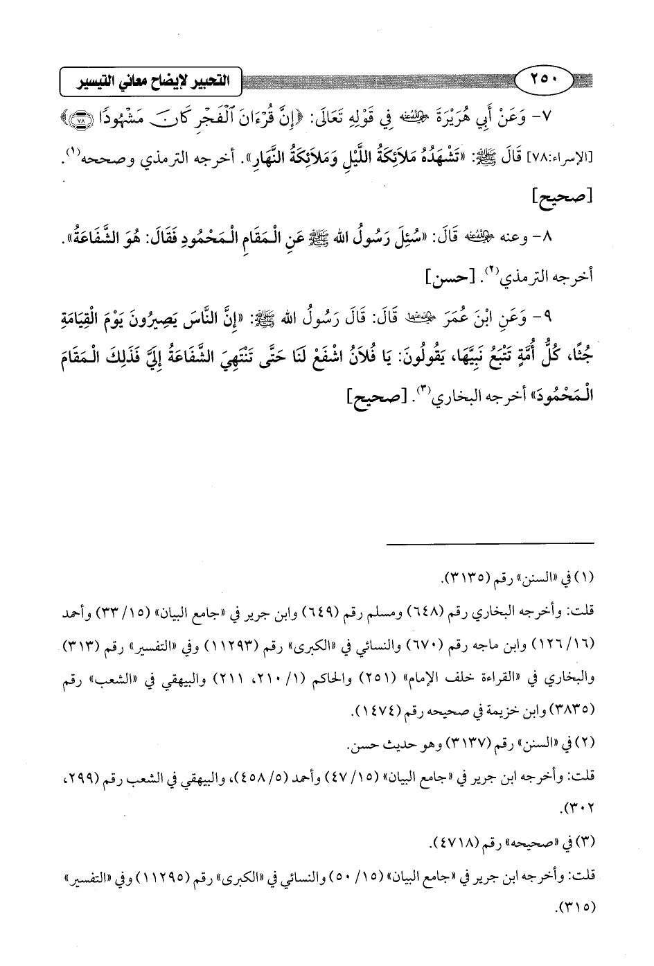 7 - وَعَنْ أَبِي هُرَيْرَةَ - رضي الله عنه - فِي قَوْلِهِ تَعَالَى: {إِنَّ قُرْآنَ الْفَجْرِ كَانَ مَشْهُودًا (78)} [الإسراء: 78] قَالَ - صلى الله عليه وسلم -: "تَشْهَدُ مَلاَئِكَةُ اللَّيْلِ وَمَلاَئِكَةُ النَّهَارِ". أخرجه الترمذي وصححه (¬1). [صحيح]