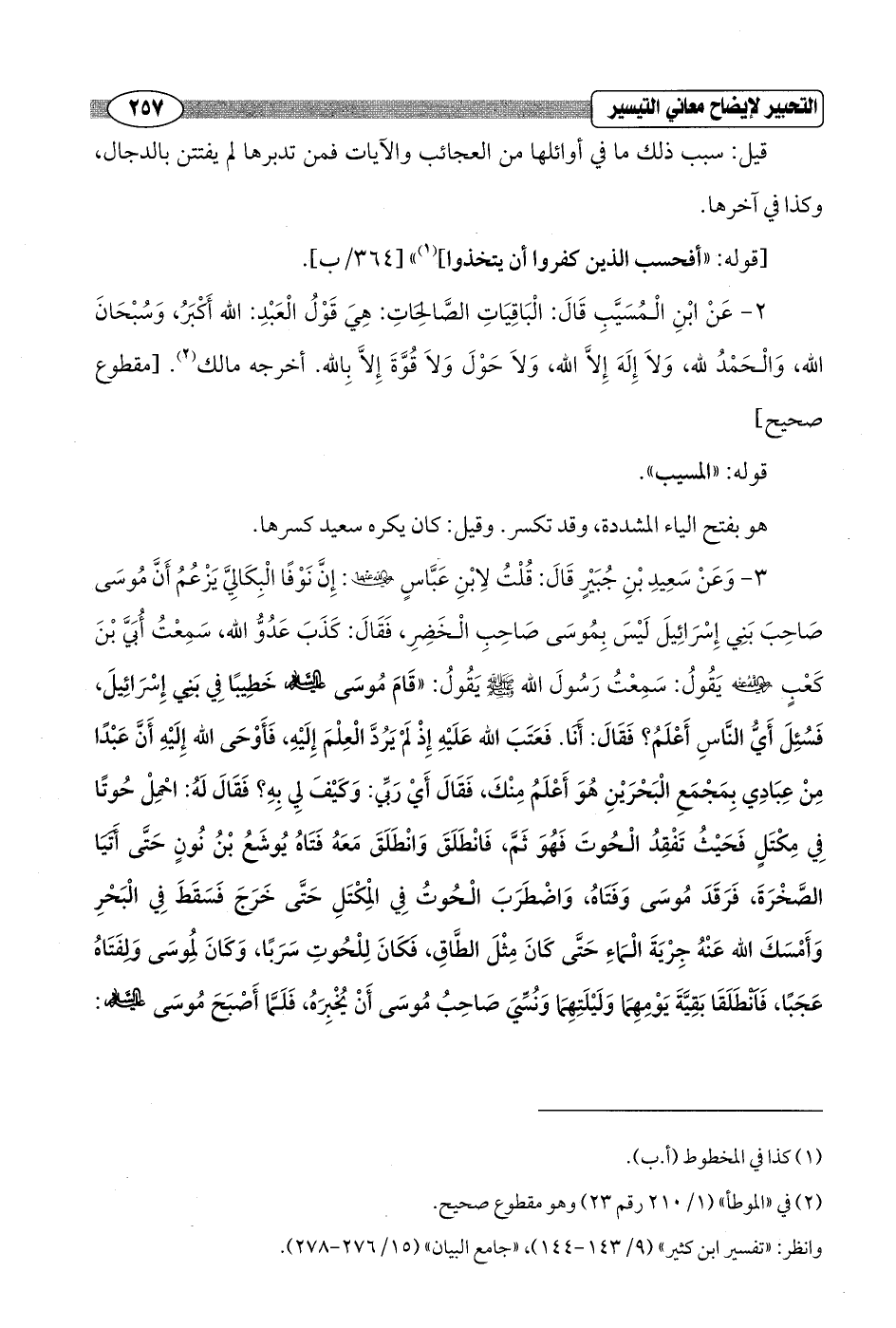 2 - عَنْ ابْنِ الْمُسَيَّبِ قَالَ: الْبَاقِيَاتِ الصَّالحِاتِ: هِيَ قَوْلُ الْعَبْدِ: الله أَكْبَرُ، وَسُبْحَانَ الله، وَالْحَمْدُ لله، وَلاَ إِلَهَ إِلاَّ الله، وَلاَ حَوْلَ وَلاَ قُوَّةَ إِلاَّ بِالله. أخرجه مالك (¬2). [مقطوع صحيح]