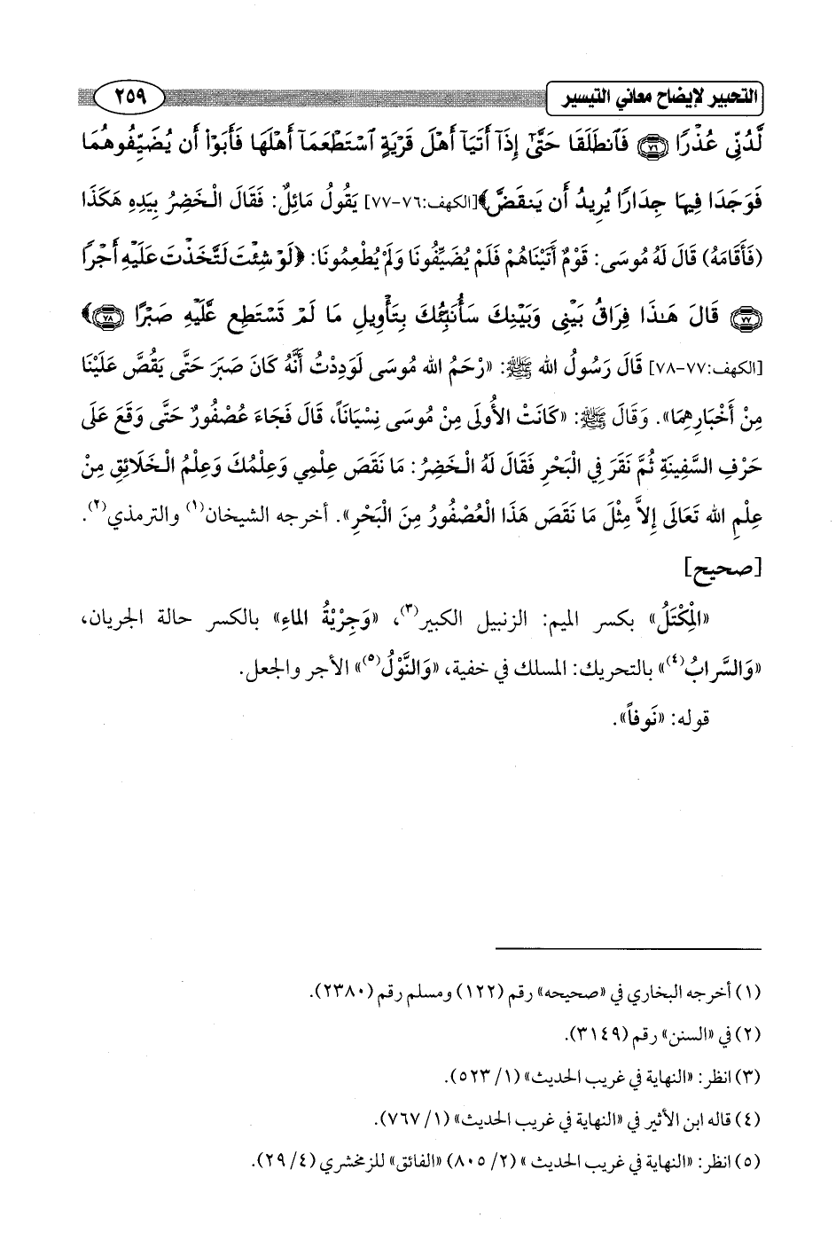 لَدُنِّي عُذْرًا (76) فَانْطَلَقَا حَتَّى إِذَا أَتَيَا أَهْلَ قَرْيَةٍ اسْتَطْعَمَا أَهْلَهَا فَأَبَوْا أَنْ يُضَيِّفُوهُمَا فَوَجَدَا فِيهَا جِدَارًا يُرِيدُ أَنْ يَنْقَضَّ} [الكهف: 76 - 77] يَقُولُ مَائِلٌ: فَقَالَ الْخَضِرُ بِيَدِهِ هَكَذَا (فَأَقَامَهُ) قَالَ لَهُ مُوسَى: قَوْمٌ أَتَيْنَاهُمْ فَلَمْ يُضَيِّفُونَا وَلَمْ يُطْعِمُونَا: {لَوْ شِئْتَ لَاتَّخَذْتَ عَلَيْهِ أَجْرًا (77) قَالَ هَذَا فِرَاقُ بَيْنِي وَبَيْنِكَ سَأُنَبِّئُكَ بِتَأْوِيلِ مَا لَمْ تَسْتَطِعْ عَلَيْهِ صَبْرًا (78)} [الكهف: 77 - 78] قَالَ رَسُوُل الله - صلى الله عليه وسلم -: "رْحَمُ الله مُوسَى لَوَدِدْتُ أَنَّهُ كَانَ صَبَرَ حَتَّى يَقُصَّ عَلَيْنَا مِنْ أَخْبَارِهِمَا". وَقَالَ - صلى الله عليه وسلم -: "كَانَتْ الأُولَى مِنْ مُوسَى نِسْيَانَاً، قَالَ فَجَاءَ عُصْفُورٌ حَتَّى وَقَعَ عَلَى حَرْفِ السَّفِينَةِ ثُمَّ نَقَرَ فِي الْبَحْرِ فَقَالَ لَهُ الْخَضِرُ: مَا نَقَصَ عِلْمِي وَعِلْمُكَ وَعِلْمُ الْخَلَائِقِ مِنْ عِلْمِ الله تَعَالَى إِلاَّ مِثْلَ مَا نَقَصَ هَذَا الْعُصْفُورُ مِنَ الْبَحْرِ". أخرجه الشيخان (¬1) والترمذي (¬2). [صحيح]