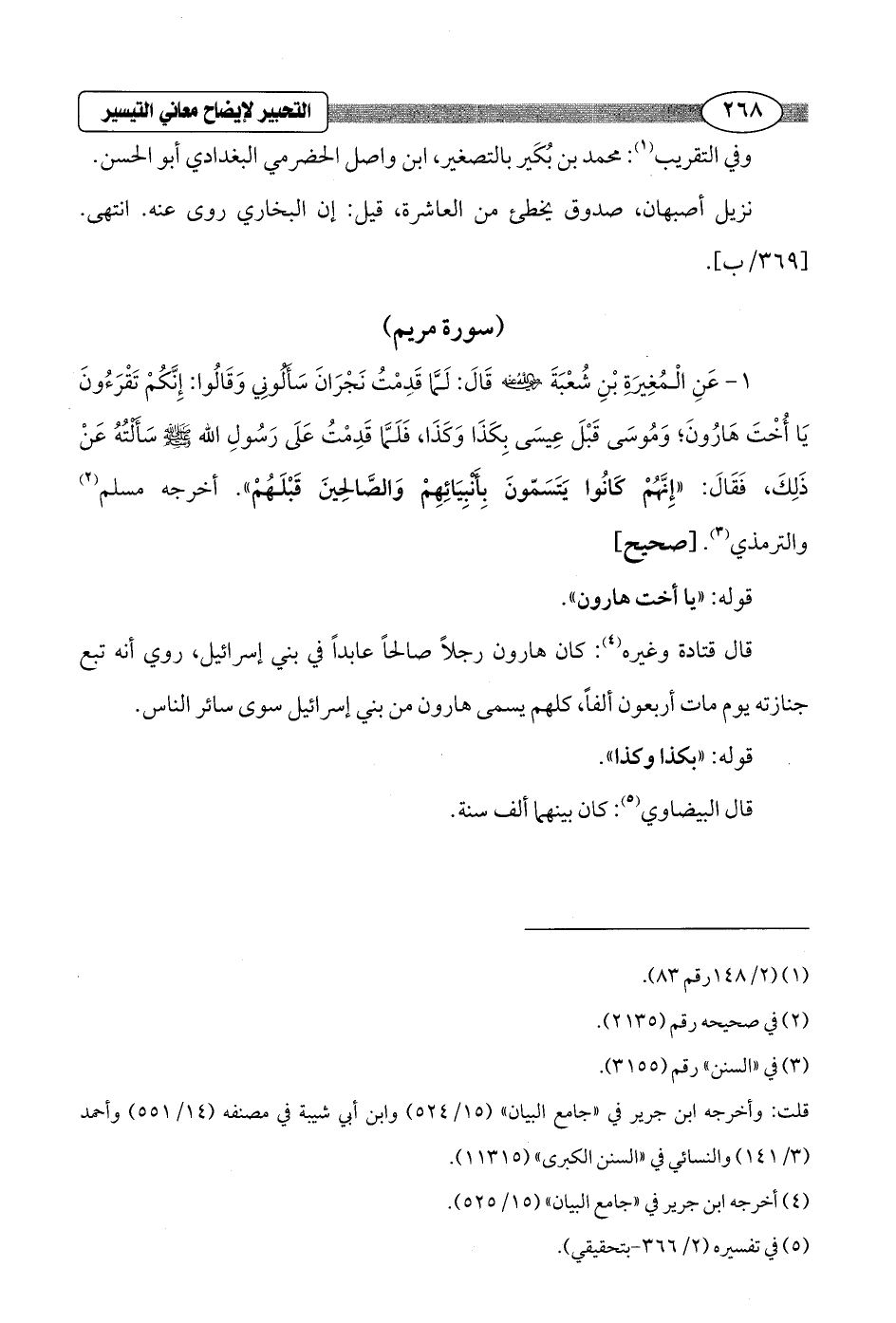 1 - عَنِ الْمُغِيرَةِ بْنِ شُعْبَةَ - رضي الله عنه - قَالَ: لَمَّا قَدِمْتُ نَجْرَانَ سَأَلونِي وَقَالُوا: إِنَّكُمْ تَقْرَءُونَ يَا أُخْتَ هَارُونَ؛ وَمُوسَى قَبْلَ عِيسَى بِكَذَا وَكَذَا، فَلَمَّا قَدِمْتُ عَلَى رَسُولِ الله - صلى الله عليه وسلم - سَأَلْتُهُ عَنْ ذَلِكَ، فَقَالَ: "إِنَّهُمْ كَانُوا يَتَسَمّونَ بِأَنَبِيَائِهِمْ وَالصَّالحِينَ قَبْلَهُمْ". أخرجه مسلم (¬2) والترمذي (¬3). [صحيح]