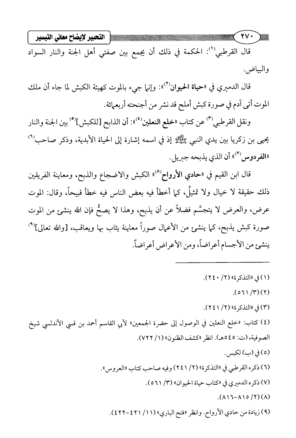 قال ابن القيم في "حادي الأرواح (¬8) " الكبش والاضجاع والذبح، ومعاينة الفريقين ذلك حقيقة لا خيال ولا تمثيلُ، كما أخطأ فيه بعض الناس فيه خطأ قبيحاً، وقال: الموت عرض، والعرض لا يتجسَّم فضلاً عن أن يذبح، وهذا لا يصحُّ فإن الله ينشئ من الموت صورة كبش يذبح، كما ينشئ من الأعمال صوراً معاينة يثاب بها ويعاقب، [والله تعالى] (¬9) ينشئ من الأجسام أعراضاً، ومن الأعراض أعراضاً.