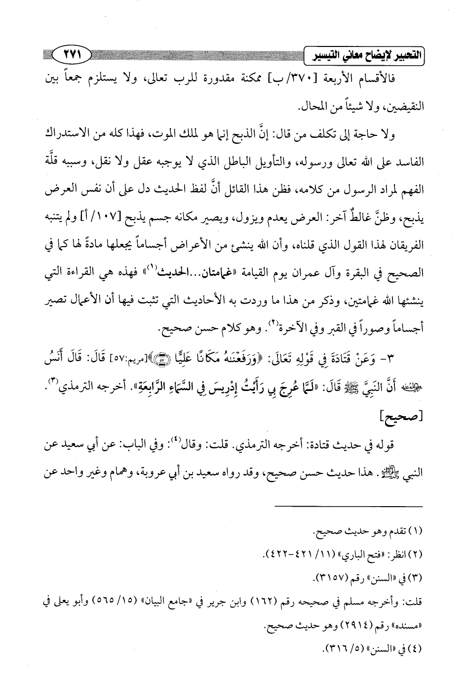 ولا حاجة إلى تكلف من قال: إنَّ الذبح إنما هو لملك الموت، فهذا كله من الاستدراك الفاسد على الله تعالى ورسوله، والتأويل الباطل الذي لا يوجبه عقل ولا نقل، وسببه قلَّة الفهم لمراد الرسول من كلامه, فظن هذا القائل أنَّ لفظ الحديث دل على أن نفس العرض يذبح، وظنَّ غالطٌ آخر: العرض يعدم ويزول، ويصير مكانه جسم يذبح [107/ أ] ولم يتنبه الفريقان لهذا القول الذي قلناه، وأن الله ينشئ من الأعراض أجساماً يجعلها مادةً لها كما في الصحيح في البقرة وآل عمران يوم القيامة "غمامتان ... الحديث (¬1) " فهذه هي القراءة التي ينشئها الله غمامتين، وذكر من هذا ما وردت به الأحاديث التي تثبت فيها أن الأعمال تصير أجساماً وصوراً في القبر وفي الآخرة (¬2). وهو كلام حسن صحيح.