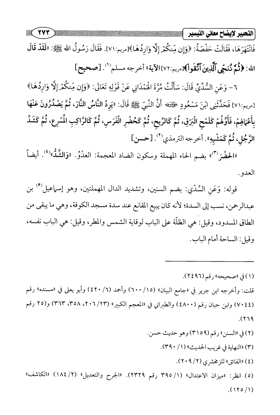 6 - وَعَنِ السُّدِّيِّ قَالَ: سَأَلْتُ مُرَّةَ الْهَمْدَانِي عَنْ قَوْلِهِ تَعَالَى: {وَإِنْ مِنْكُمْ إِلَّا وَارِدُهَا} [مريم: 71] فَحَدَّثَنِى ابْنَ مَسْعُودٍ - رضي الله عنه - أَنَّ النَّبيّ - صلى الله عليه وسلم - قَالَ: "يَرِدُ النَّاسُ النَّارَ، ثُمَّ يَصْدُرُونَ عَنْهَا بِأَعْمَالِهمْ، فَأَوَّلهُمْ كَلَمْحِ الْبَرْقِ، ثُمَّ كَالرِّيحِ، ثُمَّ كَحُضْرِ الْفَرَسِ، ثُمَّ كَالرَّاكِبِ المُسْرِع، ثُمَّ كَشَدِّ الرَّجُلِ، ثُمَّ كمَشْيِهِ". أخرجه الترمذي (¬2). [حسن]
