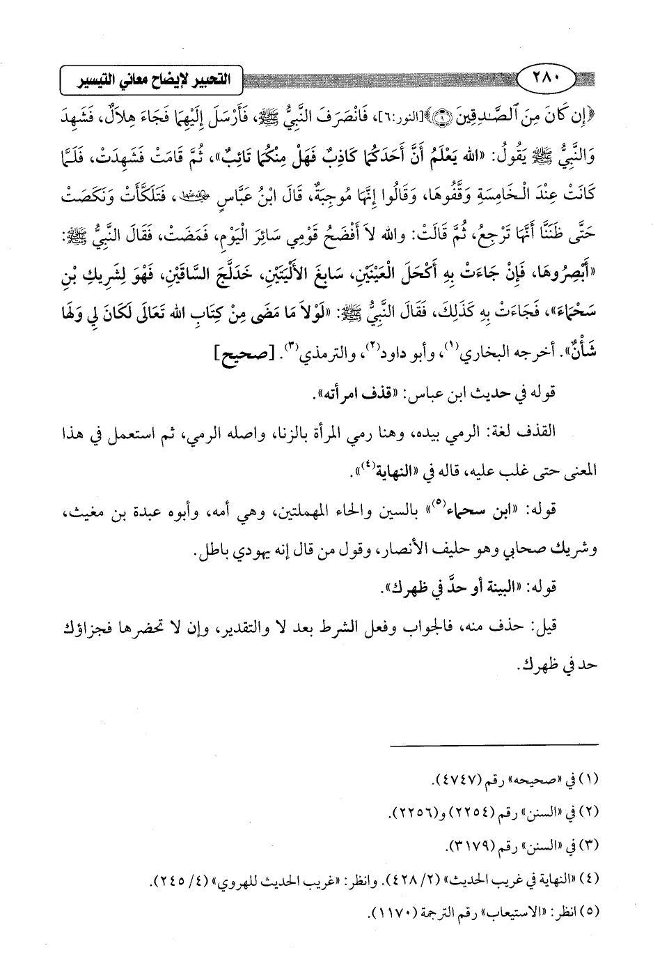 {إِنْ كَانَ مِنَ الصَّادِقِينَ (9)} [النور: 6]، فَانْصَرَفَ النَّبِيُّ - صلى الله عليه وسلم -، فَأَرْسَلَ إِلَيْهِمَا فَجَاءَ هِلاَلٌ، فَشَهِدَ وَالنَّبِيُّ - صلى الله عليه وسلم - يَقُولُ: "الله يَعْلَمُ أَنَّ أَحَدَكُمَا كَاذِبٌ فَهَلْ مِنْكُمَا تَائِبٌ"، ثُمَّ قَامَتْ فَشَهِدَتْ، فَلَمَّا كَانَتْ عِنْدَ الْخَامِسَةِ وَقَّفُوهَا، وَقَالُوا إِنَّهَا مُوجِبَةٌ، قَالَ ابْنُ عَبَّاسٍ - رضي الله عنهما -، فتَلَكَّأَتْ وَنَكَصتْ حَتَّى ظَنَنَّا أَنَّهَا تَرْجِعُ، ثُمَّ قَالَتْ: والله لاَ أَفْضَحُ قَوْمِي سَائِرَ الْيَوْمِ، فَمَضَتْ، فَقَالَ النَّبِيُّ - صلى الله عليه وسلم -: "أَبْصِرُوهَا، فَإِنْ جَاءَتْ بِهِ أَكْحَلَ الْعَيْنيْنِ، سَابغَ الأَلْيَتَيْنِ، خَدَلَّجَ السَّاقَيْنِ، فَهْوَ لِشَرِيكِ بْنِ سَحْمَاءَ"، فَجَاءَتْ بِهِ كَذَلِكَ، فَقَالَ النَّبِيُّ - صلى الله عليه وسلم -: "لَوْلاَ مَا مَضَى مِنْ كِتَابِ الله تَعَالَى كَانَ لِي وَلهَا شَأْنٌ". أخرجه البخاري (¬1)، وأبو داود (¬2)، والترمذي (¬3). [صحيح]