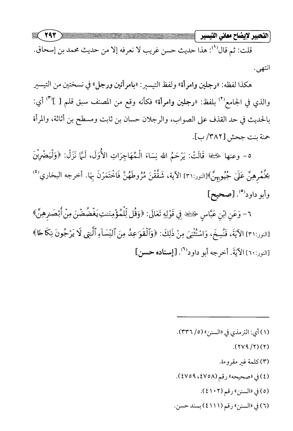 6 - وَعَنِ ابْنِ عَبَّاسٍ - رضي الله عنهما - فِي قَوْلِهِ تَعَالَى: {وَقُلْ لِلْمُؤْمِنَاتِ يَغْضُضْنَ مِنْ أَبْصَارِهِنَّ} [النور: 31] الآيَةَ، فَنُسِخَ، وَاسْتُثْنِىَ مِنْ ذَلِكَ: {وَالْقَوَاعِدُ مِنَ النِّسَاءِ اللَّاتِي لَا يَرْجُونَ نِكَاحًا} [النور: 60] الآيَةَ. أخرجه أبو داود (¬6). [إسناده حسن]