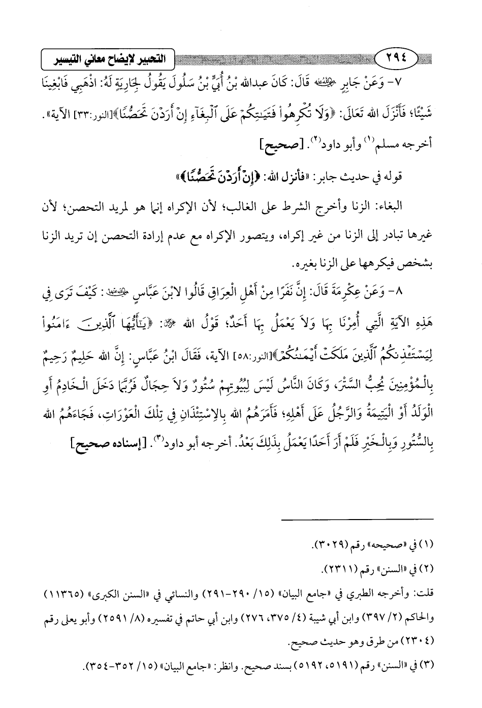 7 - وَعَنْ جَابِرٍ - رضي الله عنه - قَالَ: كَانَ عبد الله بْنُ أُبَيًّ بْنُ سَلُولَ يَقُولُ لجارِيةٍ لَهُ: اذْهَبِي فابْغِينَا شَيْئًا؛ فَأَنْزَلَ الله تَعَالَى: {وَلَا تُكْرِهُوا فَتَيَاتِكُمْ عَلَى الْبِغَاءِ إِنْ أَرَدْنَ تَحَصُّنًا} [النور: 33] الآية". أخرجه مسلم (¬1) وأبو داود (¬2). [صحيح]
