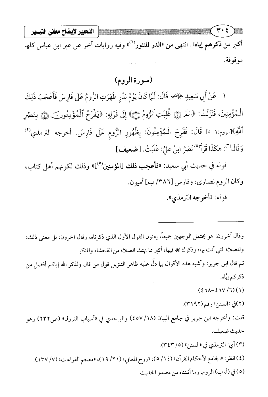 1 - عَنْ أَبِي سَعِيدٍ - رضي الله عنه - قَالَ: لَمَّا كَانَ يَوْمُ بَدْرٍ ظَهَرَتِ الرُّومُ عَلَى فَارِسَ فَأَعْجَبَ ذَلِكَ الْمُؤْمِنِينَ، فَنَزَلَتْ: {الم (1) غُلِبَتِ الرُّومُ (2)} إِلَى قَوْلِهِ: {يَفْرَحُ الْمُؤْمِنُونَ (4) بِنَصْرِ اللَّهِ} [الروم: 1 - 5] قَالَ: فَفَرِحَ الْمُؤْمِنُونَ: بِظُهُورِ الرُّومِ عَلَى فَارِسَ. أخرجه الترمذي (¬2) وَقَالَ (¬3): هكَذَا قَرَأَ (¬4) نَصْرُ ابنُ عليٍّ: غَلَبَتْ. [ضعيف]