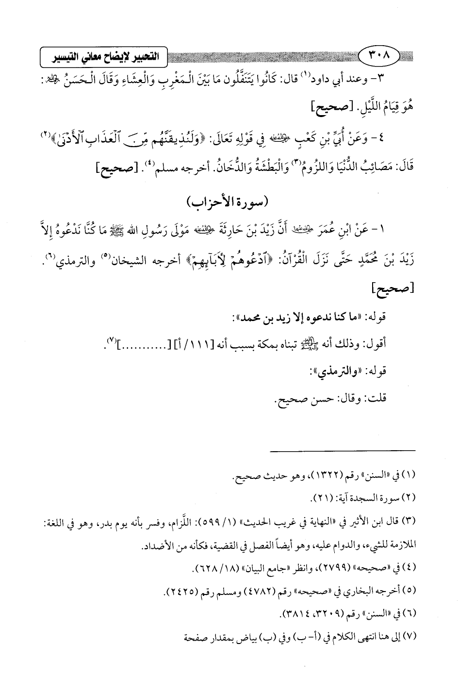 1 - عَنْ ابْنِ عُمَرَ - رضي الله عنهما - أَنَّ زَيْدَ بْنَ حَارِثَةَ - رضي الله عنه - مَوْلَى رَسُولِ الله - صلى الله عليه وسلم - مَا كُنَّا نَدْعُوهُ إِلاَّ زَيْدَ بْنَ مُحَمَّدٍ حَتَّى نَزَلَ الْقُرانُ: {ادْعُوهُمْ لِآبَائِهِمْ} أخرجه الشيخان (¬5) والترمذي (¬6). [صحيح]