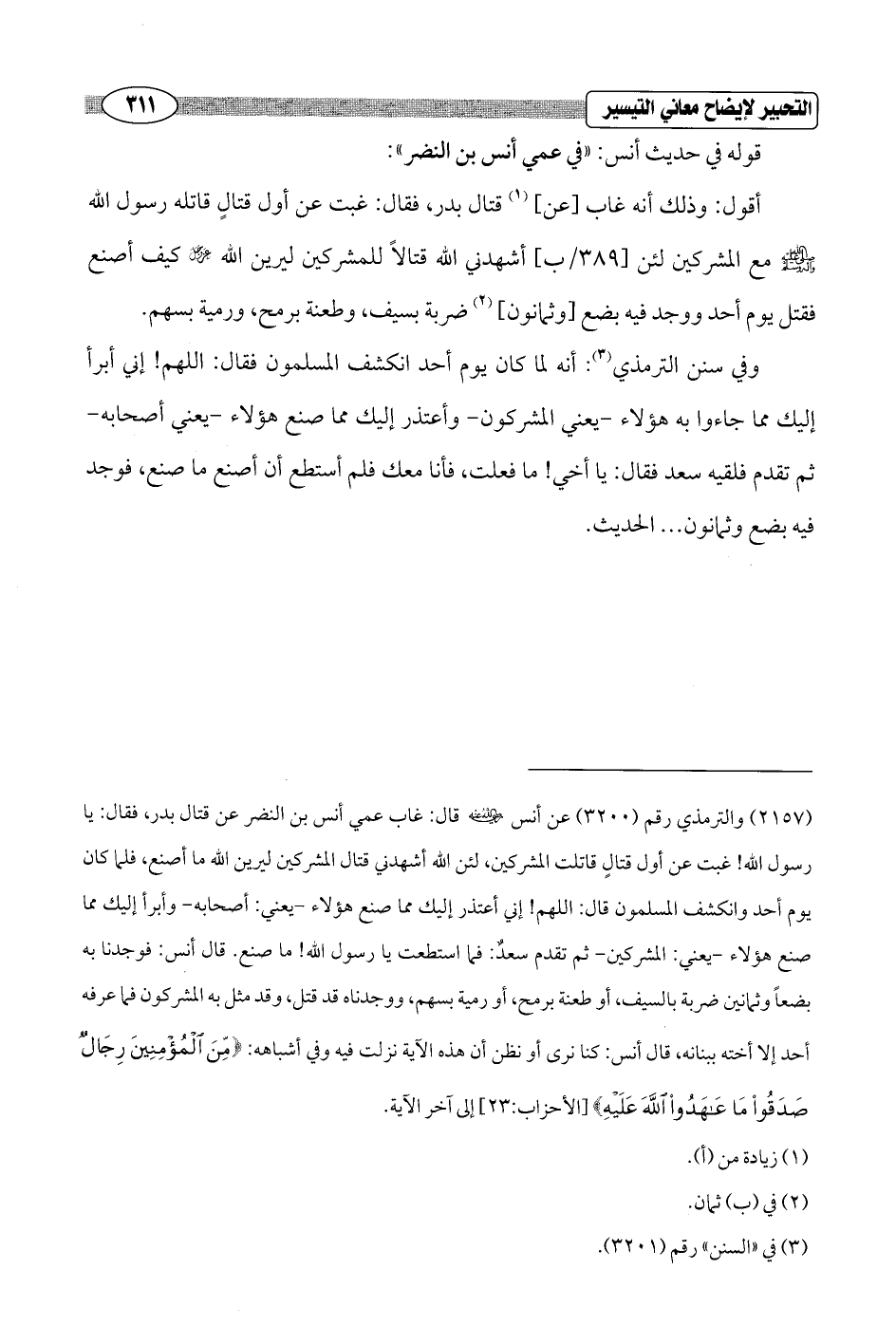 = (2157) والترمذي رقم (3200) عن أنس - رضي الله عنه - قال: غاب عمي أنس بن النضر عن قتال بدر، فقال: يا رسول الله! غبت عن أول قتالٍ قاتلت المشركين، لئن الله أشهدني قتال المشركين ليرين الله ما أصنع، فلما كان يوم أحد وانكشف المسلمون قال: اللهم! إني أعتذر إليك مما صنع هؤلاء - يعني: أصحابه - وأبرأ إليك مما صنع هؤلاء - يعني: المشركين - تم تقدم سعدٌ: فما استطعت يا رسول الله! ما صنع. قال أنس: فوجدنا به بضعاً وثمانين ضربة بالسيف، أو طعنة برمح، أو رمية بسهم، ووجدناه قد قتل، وقد مثل به المشركون فما عرفه أحد إلا أخته ببنانه، قال أنس: كنا نرى أو نظن أن هده الآية نزلت فيه وفي أشباهه: {مِنَ الْمُؤْمِنِينَ رِجَالٌ صَدَقُوا مَا عَاهَدُوا اللَّهَ عَلَيْهِ} [الأحزاب: 23] إلى آخر الآية.