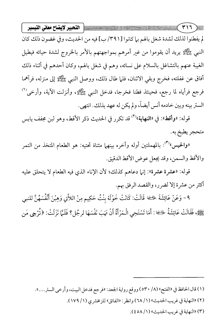 لم يفطنوا لذلك لشدة شغل بالهم بما كانوا [391/ ب] فيه من الحديث، وفي غضون ذلك كان النبي - صلى الله عليه وسلم - يريد أن يقوموا من غير أمرهم بمواجهتهم بالأمر بالخروج لشدة حيائه فيطيل الغيبة عنهم بالتشاغل بالسلام على نسائه، وهم في شغل بالهم، وكان أحدهم في أثناء ذلك أفاق عن غفلته، فخرج وبقي الاثنان، فلما طال ذلك، ووصل النبي - صلى الله عليه وسلم - إلى منزله، فرآهما فرجع فرأياه لما رجع، فحينئذ فطنا فخرجا، فدخل النبي - صلى الله عليه وسلم -، وأنزلت الآية، وأرخى (¬1) الستر بينه وبين خادمه أنس أيضاً، ولم يكن له عهد بذلك. انتهى.