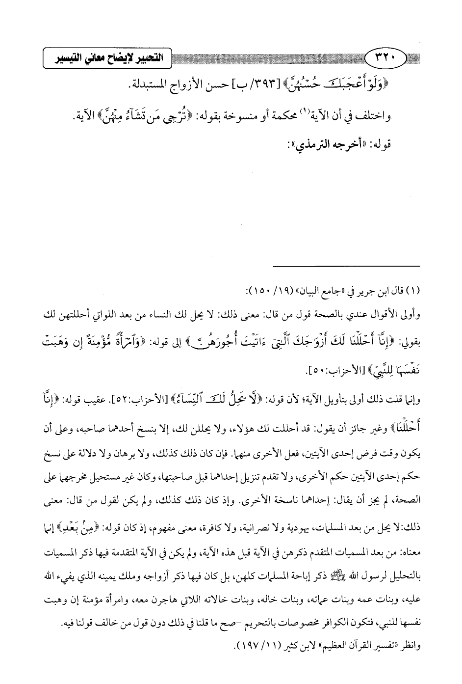 وإنما قلت ذلك أولى بتأويل الآية؛ لأن قوله: {لَا يَحِلُّ لَكَ النِّسَاءُ} [الأحزاب: 52]. عقيب قوله: {إِنَّا أَحْلَلْنَا} وغير جائز أن يقول: قد أحللت لك هؤلاء، ولا يحللن لك، إلا بنسخ أحدهما صاحبه، وعلى أن يكون وقت فرض إحدى الآيتين، فعل الأخرى منهما. فإن كان ذلك كذلك، ولا برهان ولا دلالة على نسخ حكم إحدى الآيتين حكم الأخرى، ولا تقدم تنزيل إحداهما قبل صاحبتها، وكان غير مستحيل مخرجهما على الصحة، لم يجز أن يقال: إحداهما ناسخة الأخرى. وإذ كان ذلك كذلك، ولم يكن لقول من قال: معنى ذلك: لا يحل من بعد المسلمات، يهودية ولا نصرانية، ولا كافرة، معنى مفهوم، إذ كان قوله: {مِنْ بَعْدُ} إنما معناه: من بعد المسميات المتقدم ذكرهن في الآية قبل هذه الآية، ولم يكن في الآية المتقدمة فيها ذكر المسميات بالتحليل لرسول الله - صلى الله عليه وسلم - ذكر إباحة المسلمات كلهن، بل كان فيها ذكر أزواجه وملك يمينه الذي يفيء الله عليه، وبنات عمه وبنات عماته, وبنات خاله، وبنات خالاته اللاتي هاجرن معه, وامرأة مؤمنة إن وهبت نفسها للنبي، فتكون الكوافر مخصوصات بالتحريم - صح ما قلنا في ذلك دون قول من خالف قولنا فيه.