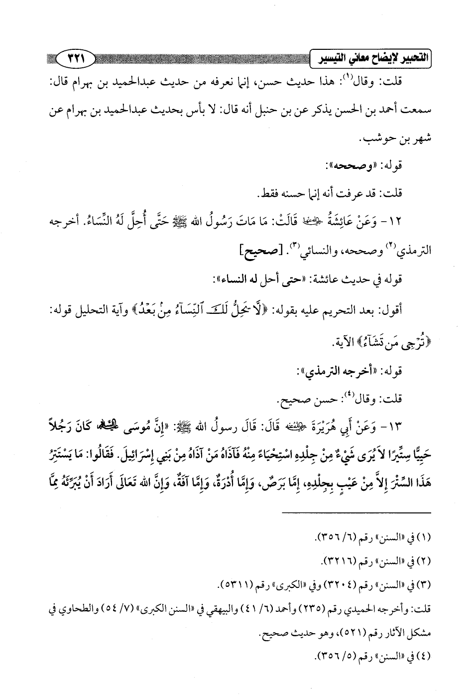 12 - وَعَنْ عَائِشَةُ - رضي الله عنها - قَالَتْ: مَا مَاتَ رَسُولُ الله - صلى الله عليه وسلم - حَتَّى أُحِلَّ لَهُ النِّسَاءُ. أخرجه الترمذي (¬2) وصححه، والنسائي (¬3). [صحيح]