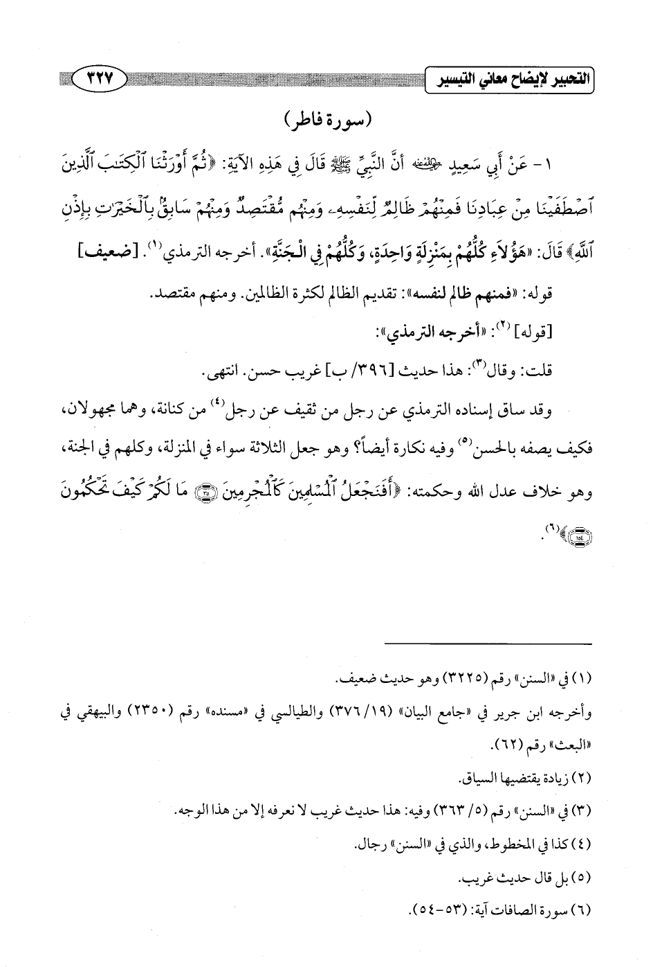 1 - عَنْ أَبِي سَعِيدٍ - رضي الله عنه - أنَّ النَّبِيِّ - صلى الله عليه وسلم - قَالَ فِي هَذِهِ الآيَةِ: {ثُمَّ أَوْرَثْنَا الْكِتَابَ الَّذِينَ اصْطَفَيْنَا مِنْ عِبَادِنَا فَمِنْهُمْ ظَالِمٌ لِنَفْسِهِ وَمِنْهُمْ مُقْتَصِدٌ وَمِنْهُمْ سَابِقٌ بِالْخَيْرَاتِ بِإِذْنِ اللَّهِ} قَالَ: "هَؤُلاَءِ كُلُّهُمْ بِمَنْزِلَةٍ وَاحِدَةٍ، وَكُلُّهُمْ فِي الْجَنَّةِ". أخرجه الترمذي (¬1). [ضعيف]