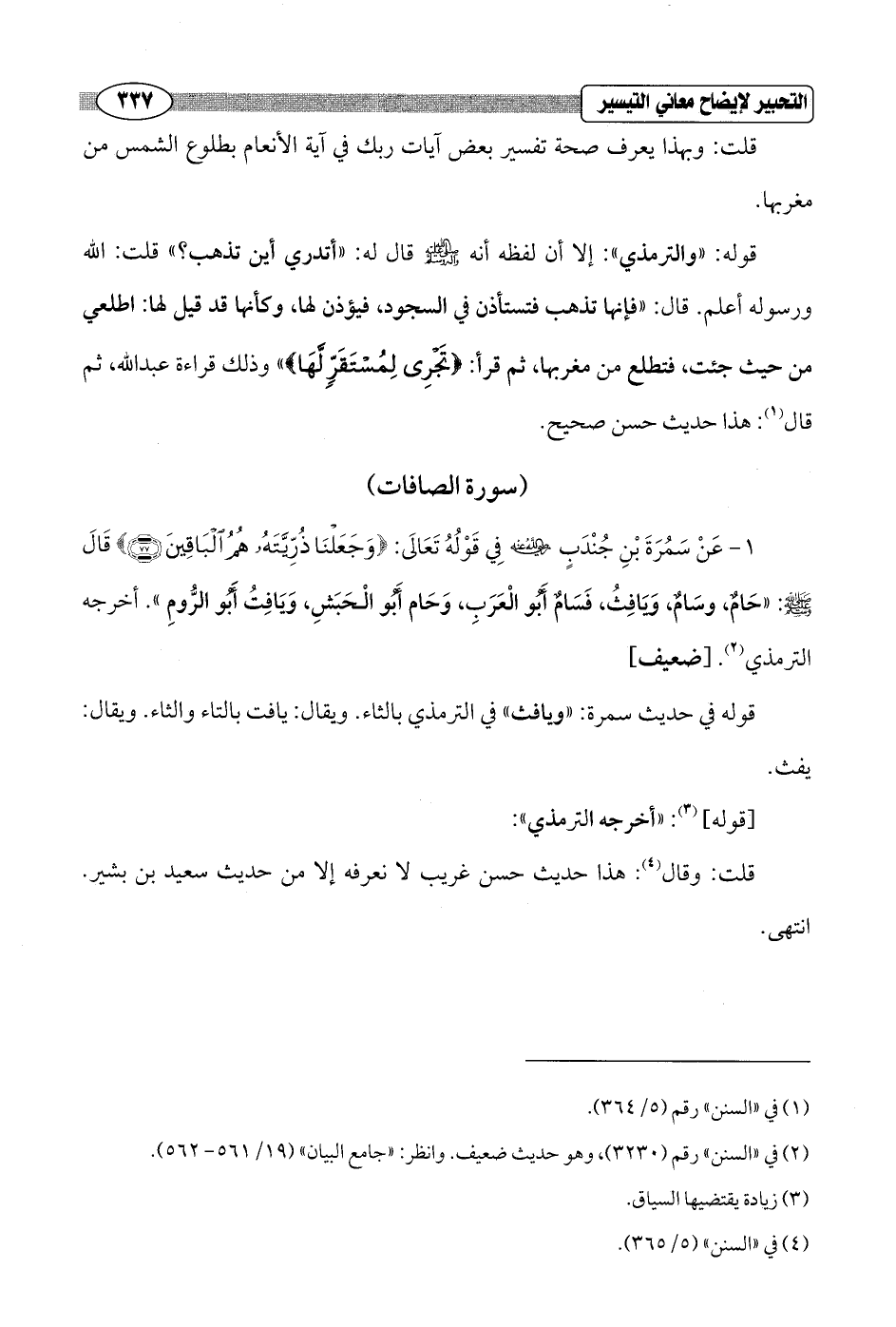 قوله: "والترمذي": إلا أن لفظه أنه - صلى الله عليه وسلم - قال له: "أتدري أين تذهب؟ " قلت: الله ورسوله أعلم. قال: "فإنها تذهب فتستأذن في السجود، فيؤذن لها، وكأنها قد قيل لها: اطلعي من حيث جئت، فتطلع من مغربها، ثم قرأ: {تَجْرِي لِمُسْتَقَرٍّ لَهَا} " وذلك قراءة عبد الله، ثم قال (¬1): هذا حديث حسن صحيح.