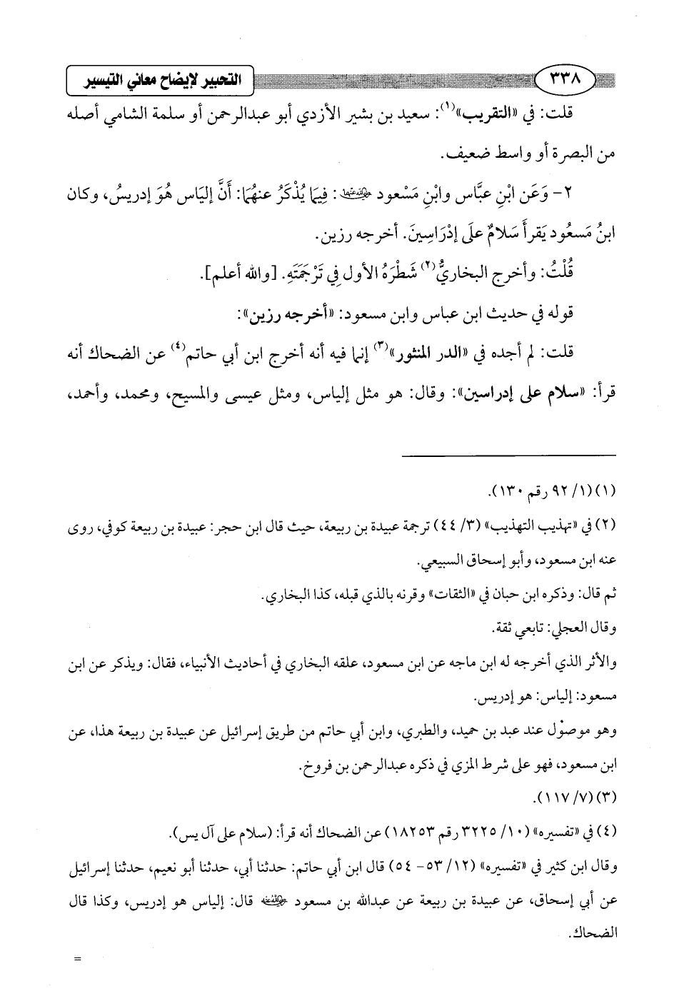 وقال ابن كثير في "تفسيره" (12/ 53 - 54) قال ابن أبي حاتم: حدثنا أبي، حدثنا أبو نعيم، حدثنا إسرائيل عن أبي إسحاق، عن عبيدة بن ربيعة عن عبد الله بن مسعود - رضي الله عنه - قال: إلياس هو إدريس، وكذا قال الضحاك. =