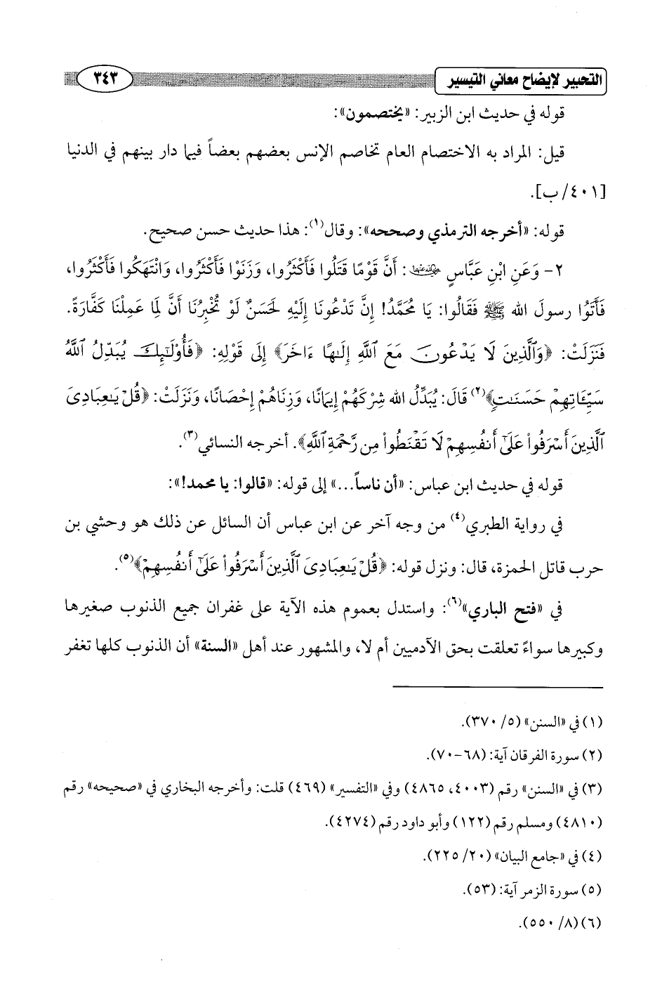 2 - وَعَنِ ابْنِ عَبَّاسٍ - رضي الله عنهما -: أَنَّ قَوْمًا قَتَلُوا فَأَكْثَرُوا، وَزَنَوْا فَأَكْثَرُوا، وَانْتَهَكُوا فَأَكْثَرُوا، فَأَتَوُا رسولَ الله - صلى الله عليه وسلم - فَقَالُوا: يَا مُحَمَّدُ! إِنَّ تَدْعُونَا إِلَيْهِ لَحَسَنٌ لَوْ تُخْبِرُنَا أَنَّ لِمَا عَمِلْنَا كَفَّارَةً. فَنَزَلَتْ: {وَالَّذِينَ لَا يَدْعُونَ مَعَ اللَّهِ إِلَهًا آخَرَ} إِلَى قَوْلِهِ: {فَأُولَئِكَ يُبَدِّلُ اللَّهُ سَيِّئَاتِهِمْ حَسَنَاتٍ} (¬2) قَالَ: يُبَدِّلُ الله شِرْكَهُمْ إِيمَانًا، وَزِنَاهُمْ إِحْصَانًا، وَنَزَلَتْ: {قُلْ يَاعِبَادِيَ الَّذِينَ أَسْرَفُوا عَلَى أَنْفُسِهِمْ لَا تَقْنَطُوا مِنْ رَحْمَةِ اللَّهِ}. أخرجه النسائي (¬3).