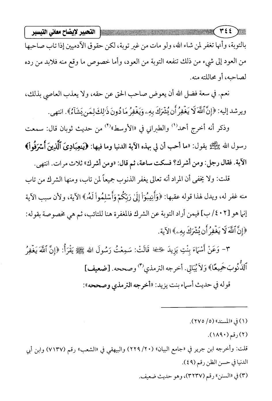 3 - وَعَنْ أَسْمَاءَ بِنْتِ يَزِيدَ - رضي الله عنها - قَالَتْ: سَمِعْتُ رَسُولَ الله - صلى الله عليه وسلم - يَقْرَأُ: {إِنَّ اللَّهَ يَغْفِرُ الذُّنُوبَ جَمِيعًا} وَلاَ يُبَالِى. أخرجه الترمذي (¬3) وصححه. [ضعيف]