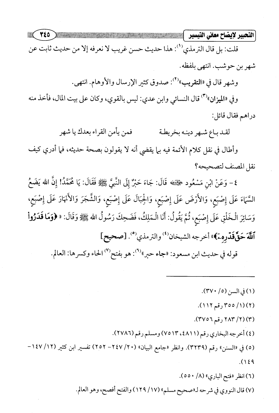 4 - وَعَنْ ابْنِ مَسْعُود - رضي الله عنه - قَالَ: جَاءَ حبْرٌ إِلَى النَّبيَّ - صلى الله عليه وسلم - فقَالَ: يَا مُحَمَّدُ! إِنَّ الله يَضَعُ السَّمَاءَ عَلَى إِصْبَعٍ، وَالأَرْضَ عَلَى إِصْبَعٍ، وَالجبَالَ عَلَى إِصْبَعٍ، وَالشَّجَرَ وَالأَنْهَارَ عَلَى إِصْبَعٍ، وَسَائِرَ الْخَلْقِ عَلَى إِصْبَعٍ، ثُمَّ يَقُولُ: أَنَا الْمَلِكُ، فَضَحِكَ رَسُولُ الله - صلى الله عليه وسلم - وَقَالَ: " {وَمَا قَدَرُوا اللَّهَ حَقَّ قَدْرِهِ} " أخرجه الشيخان (¬4) والترمذي (¬5). [صحيح]