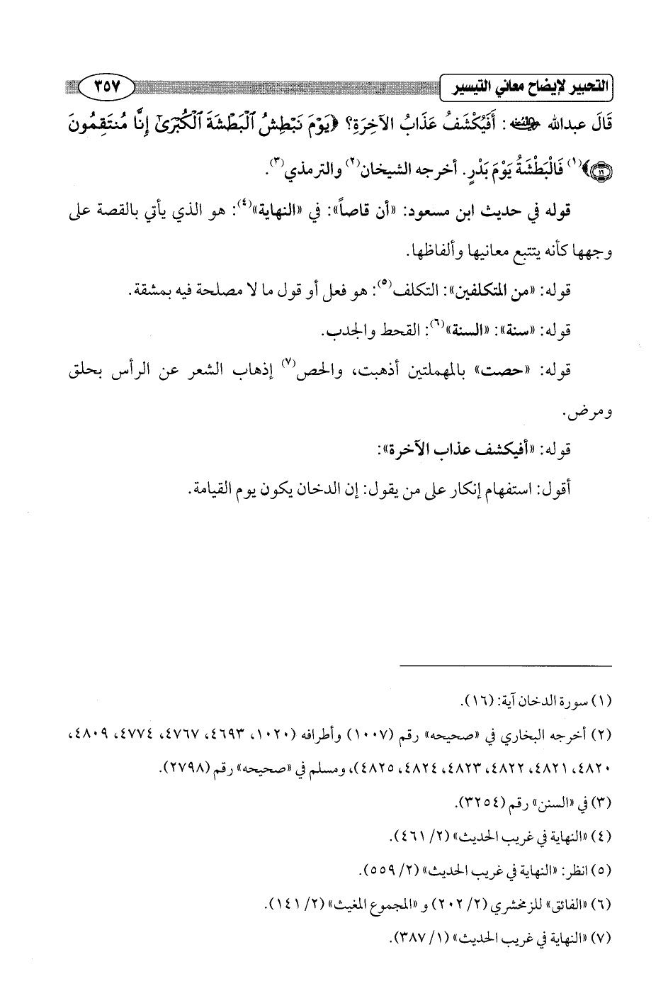 قَالَ عبد الله - رضي الله عنه -: أَفَيُكْشَفُ عَذابُ الآخِرَةِ؟ {يَوْمَ نَبْطِشُ الْبَطْشَةَ الْكُبْرَى إِنَّا مُنْتَقِمُونَ (16)} (¬1) فَالْبَطْشَةُ يَوْمَ بَدْرٍ. أخرجه الشيخان (¬2) والترمذي (¬3).
