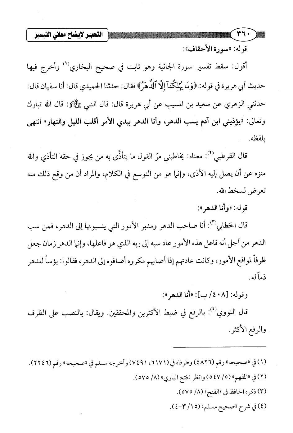 أقول: سقط تفسير سورة الجاثية وهو ثابت في صحيح البخاري (¬1) وأخرج فيها حديث أبي هريرة في قوله: {وَمَا يُهْلِكُنَا إِلَّا الدَّهْرُ} فقال: حدثنا الحميدي قال: أنا سفيان قال: حدثني الزهري عن سعيد بن المسيب عن أبي هريرة قال: قال النبي - صلى الله عليه وسلم -: قال الله تبارك وتعالى: "يؤذيني ابن آدم يسب الدهر، وأنا الدهر بيدي الأمر أقلب الليل والنهار" انتهى بلفظه.