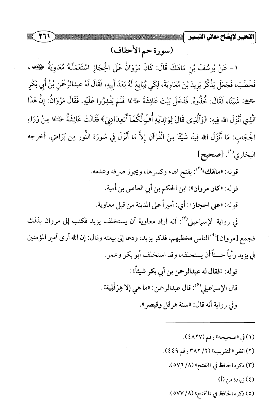 1 - عَنْ يُوسُفَ بْنِ مَاهَكَ قَالَ: كَانَ مَرْوَانُ عَلَى الْحِجَازِ اسْتَعْمَلَهُ مُعَاوِيَةُ - رضي الله عنه -، فَخَطَبَ، فَجَعَلَ يَذْكُرُ يَزِيدَ بْنَ مُعَاوِيَةَ، لِكَي يُبَايِعَ لَهُ بَعْدَ أَبِيهِ، فَقَالَ لَهُ عَبْدُ الرَّحْمَنِ بْنُ أَبِي بَكْرٍ - رضي الله عنهما - شَيْئًا، فَقَالَ: خُذُوهُ. فَدَخَلَ بَيْتَ عَائِشَةَ - رضي الله عنها - فَلَمْ يَقْدِرُوا عَلَيْهِ, فَقَالَ مَرْوَانُ: إِنَّ هَذَا الَّذِى أَنْزَلَ الله فِيهِ: {وَالَّذِى قَالَ لِوَالِدَيْهِ أُفٍّ لَكُمَا أَتَعِدَانِنِى} فَقَالَتْ عَائِشَةُ - رضي الله عنها - مِنْ وَرَاءِ الْحِجَابِ: مَا أَنْزَلَ الله فِينَا شَيْئًا مِنَ الْقُرْآنِ إِلاَّ ما أَنْزَلَ في سُورَة النُّور مِنْ بَراءتي. أخرجه البخاري (¬1). [صحيح]