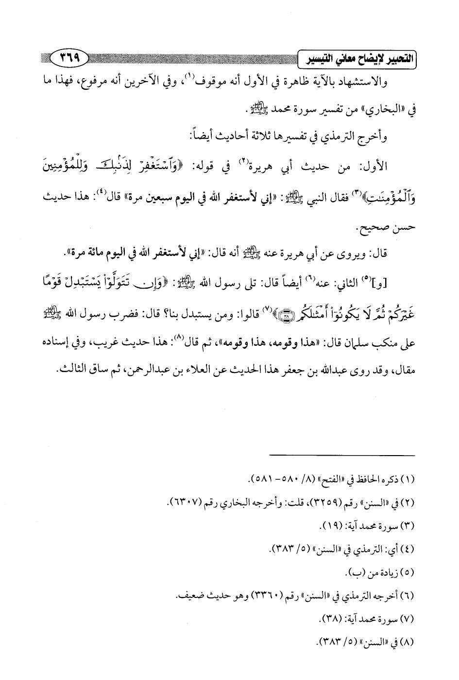 الأول: من حديث أبي هريرة (¬2) في قوله: {وَاسْتَغْفِرْ لِذَنْبِكَ وَلِلْمُؤْمِنِينَ وَالْمُؤْمِنَاتِ} (¬3) فقال النبي - صلى الله عليه وسلم -: "إني لأستغفر الله في اليوم سبعين مرة" قال (¬4): هذا حديث حسن صحيح.