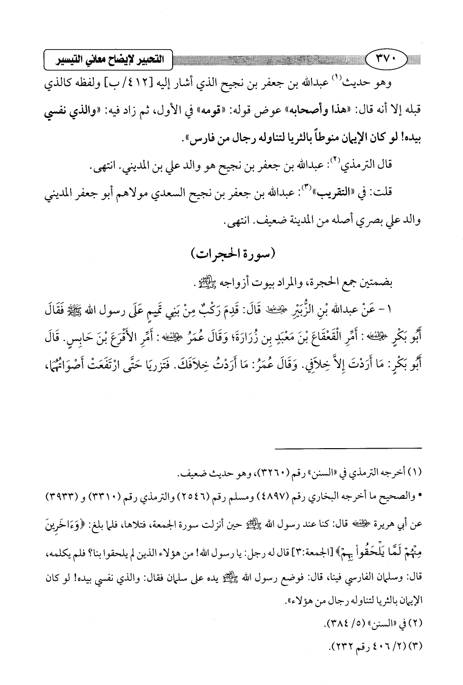 • والصحيح ما أخرجه البخاري رقم (4897) ومسلم رقم (2546) والترمذي رقم (3310) و (3933) عن أبي هريرة - رضي الله عنه - قال: كنا عند رسول الله - صلى الله عليه وسلم - حين أنزلت سورة الجمعة فتلاها، فلما بلغ: {وَآخَرِينَ مِنْهُمْ لَمَّا يَلْحَقُوا بِهِمْ} [الجمعة: 3] قال له رجل: يا رسول الله! من هؤلاء الذين لم يلحقوا بنا؟ فلم يكلمه، قال: وسلمان الفارسي فينا، قال: فوضع رسول الله - صلى الله عليه وسلم - يده على سلمان فقال: والذي نفسي بيده! لو كان الإيمان بالثريا لتناوله رجال من هؤلاء".