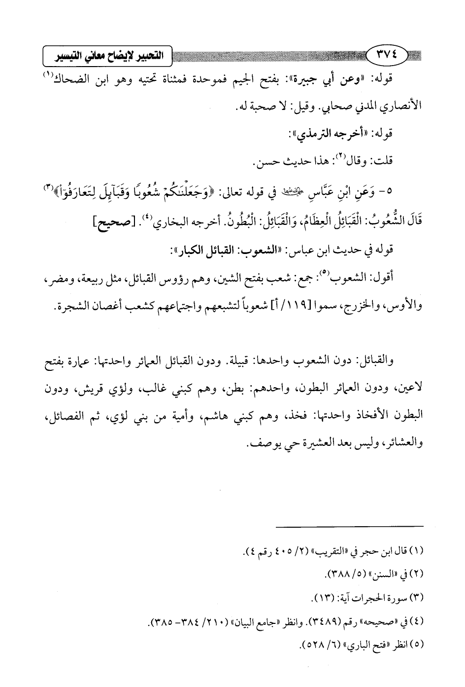 5 - وَعَنِ ابْنِ عَبّاسِ - رضي الله عنهما - في قوله تعالى: {وَجَعَلْنَاكُمْ شُعُوبًا وَقَبَائِلَ لِتَعَارَفُوا} (¬3) قالَ الشُّعُوبُ: الْقَبائِلُ الْعِظامُ، والْقَبائِلُ: الْبُطُونُ. أخرجه البخاري (¬4). [صحيح]