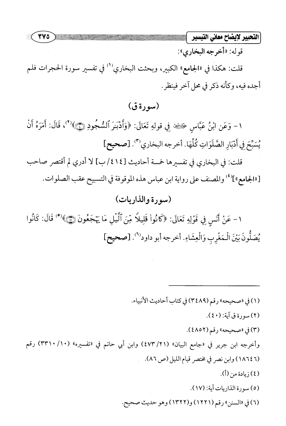 1 - وَعَن ابْنُ عَبّاسٍ - رضي الله عنهما - في قولهِ تَعالَى: {وَأَدْبَارَ السُّجُودِ (40)} (¬2)، قَالَ: أَمَرَهُ أَنْ يُسَبِّحَ في أدْبَارِ الصَّلَوَاتِ كُلِّهَا. أخرجه البخاري (¬3). [صحيح]