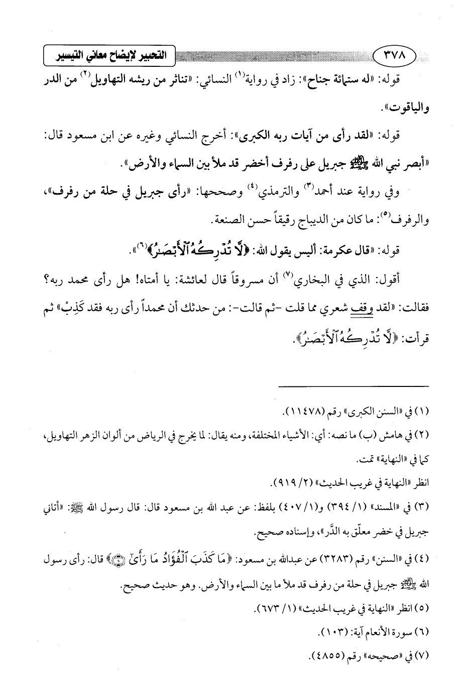 (¬4) في "السنن" رقم (3283) عن عبد الله بن مسعود: {مَا كَذَبَ الْفُؤَادُ مَا رَأَى (11)} قال: رأى رسول الله - صلى الله عليه وسلم - جبريل في حلة من رفرف قد ملأ ما بين السماء والأرض. وهو حديث صحيح.