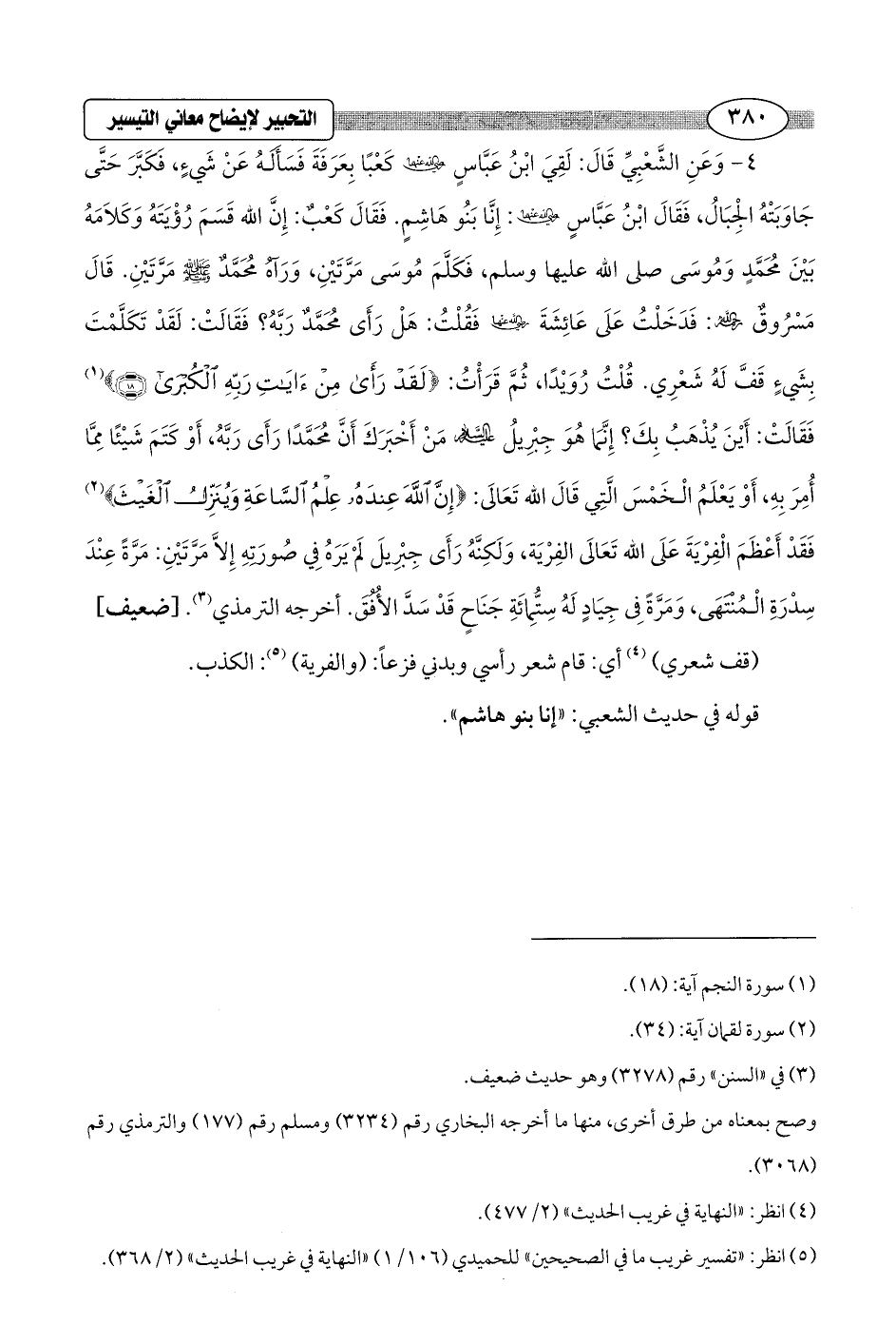 4 - وَعَنِ الشَّعْبِيِّ قَالَ: لَقِيَ ابْنُ عَبَّاسٍ - رضي الله عنهما - كَعْبًا بِعَرَفَةَ فَسَأَلَهُ عَنْ شَيْءٍ، فَكَبَّرَ حَتَّى جَاوَبَتْهُ الجِبَالُ، فَقَالَ ابْنُ عَبَّاسٍ - رضي الله عنهما -: إِنَّا بَنُو هَاشِمٍ. فَقَالَ كَعْبٌ: إِنَّ الله قَسَمَ رُؤْيَتَهُ وَكَلاَمَهُ بَيْنَ مُحَمَّدٍ وَمُوسَى صل الله عليهما وسلم، فَكَلَّمَ مُوسَى مَرَّتَيْنِ، وَرَآهُ مُحَمَّدٌ - صلى الله عليه وسلم - مَرَّتَيْنِ. قَالَ مَسْرُوقٌ - رحمه الله -: فَدَخَلْتُ عَلَى عَائِشَةَ - رضي الله عنها - فَقُلْتُ: هَلْ رَأَى مُحَمَّدٌ رَبَّهُ؟ فَقَالَتْ: لَقَدْ تَكَلَّمْتَ بِشَيءٍ قَفَّ لَهُ شَعْرِي. قُلْتُ: رُوَيْدًا، ثُمَّ قَرَأْتُ: {لَقَدْ رَأَى مِنْ آيَاتِ رَبِّهِ الكُبْرَى (18)} (¬1) فَقَالَتْ: أَيْنَ يُذْهَبُ بِكَ؟ إِنَّمَا هُوَ جِبْرِيلُ - عليه السلام - مَنْ أَخْبَرَكَ أَنَّ مُحَمَّدًا رَأَى رَبَّهُ، أَوْ كَتَمَ شَيْئًا مِمَّا أُمِرَ بِهِ، أَوْ يَعْلَمُ الخَمْسَ الَّتِي قَالَ الله تَعَالَى: {إِنَّ اللَّهَ عِنْدَهُ عِلْمُ السَّاعَةِ وَيُنَزِّلُ الغَيْثَ} (¬2) فَقَدْ أَعْظَمَ الفِرْيَةَ عَلَى الله تَعَالى الفِرْيَةَ، وَلَكِنَّهُ رَأَى جِبْرِيلَ لَمْ يَرَهُ فِي صُورَتِهِ إِلاَّ مَرَّتَيْنِ: مَرَّةً عِنْدَ سِدْرَةِ المُنْتَهَى، وَمَرَّةً فِي جِيَادٍ لَهُ سِتُّمِائَةِ جَنَاحٍ قَدْ سَدَّ الأُفُقَ. أخرجه الترمذي (¬3). [ضعيف]