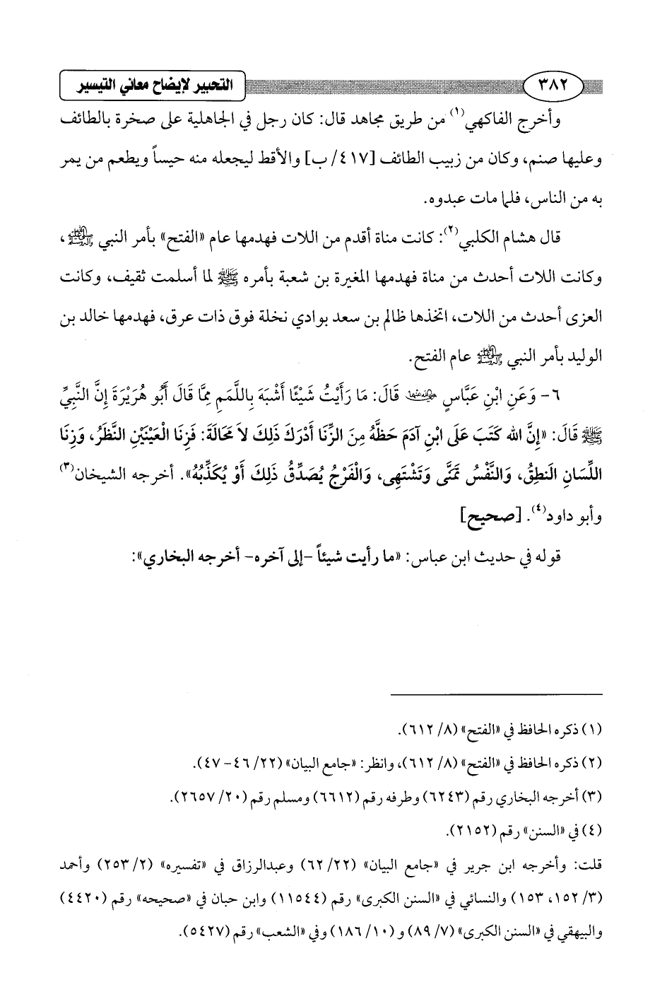 6 - وَعَنِ ابْنِ عَبَّاسٍ - رضي الله عنهما - قاَلَ: مَا رَأَيْتُ شَيْئاً أَشْبَهَ باللَّمَمِ مِمَّا قَالَ أبُو هُرَيرَةَ إِنَّ النَّبِيِّ - صلى الله عليه وسلم - قَالَ: "إنَّ الله كَتَبَ عَلَى ابنِ آدَمَ حَظَّهُ مِنَ الزِّنَا أدْرَكَ ذَلِكَ لَا مَحَالَةَ: فَزِنَا العَيْنِ النَّظَرُ، وزِنَا اللِّسَانِ النطِقُ، والنَّفْسُ تَمَنَّى وتَشْتَهِي، والفَرْجُ يُصَدِّقُ ذَلِكَ أَوْ يُكَذِّبُهُ". أخرجه الشيخان (¬3) وأبو داود (¬4). [صحيح]